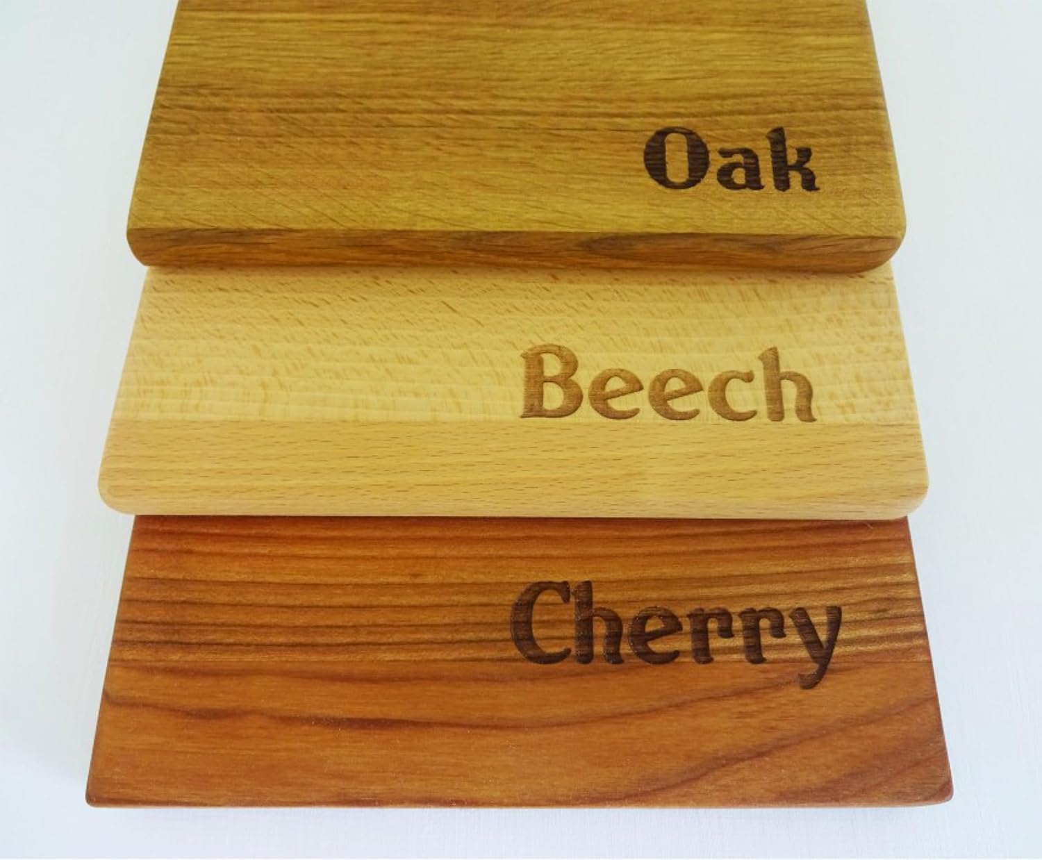 Our cutting boards are hand-crafted with precision from top materials, such as Oak, which is very sought after for its texture and grain, Cherry, which is somewhat darker in color and has a subtle orange to red hue and Beech, which is the lightest of the three species. You can choose from a variety of cutting board sizes. The thickness of all our cutting boards is 2/3'-3/4' (16- 20 mm).