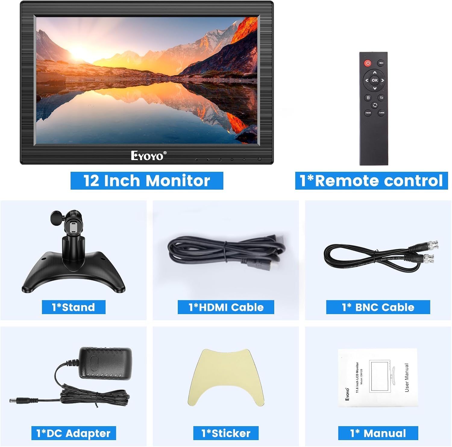 Eyoyo 12" Inch TFT LCD Monitor with AV HDMI BNC VGA Input 1366x768 Portable Mini HD Color Screen Display with Built-in Speaker