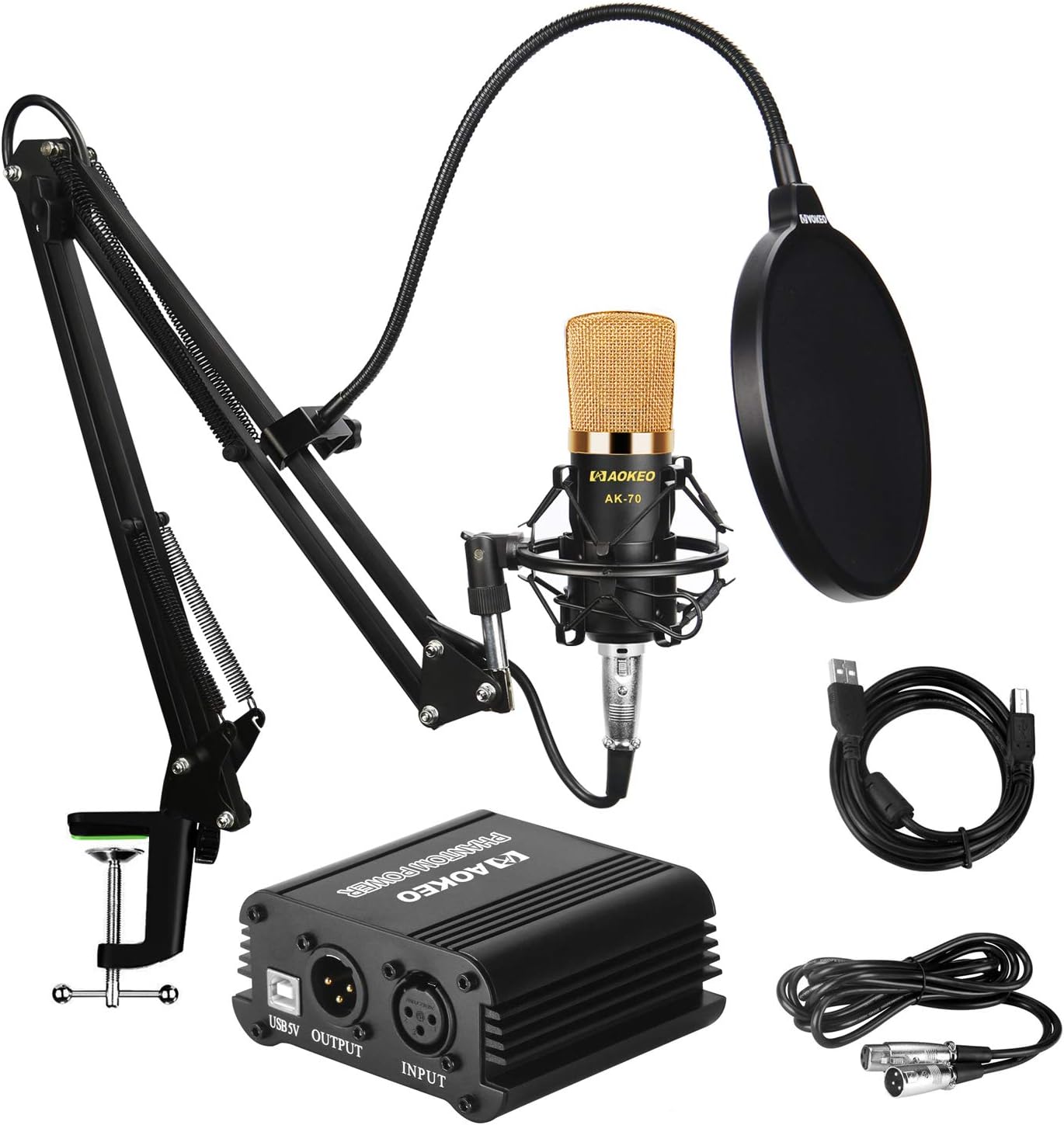 Aokeo AK-70 Professional Condenser Microphone & AK-35 Suspension Boom Scissor Arm Stand with Built-in XLR Cable and Mounting Clamp & AK-3 Pop Filter & 48V Phantom Power Supply with Adapter Kit