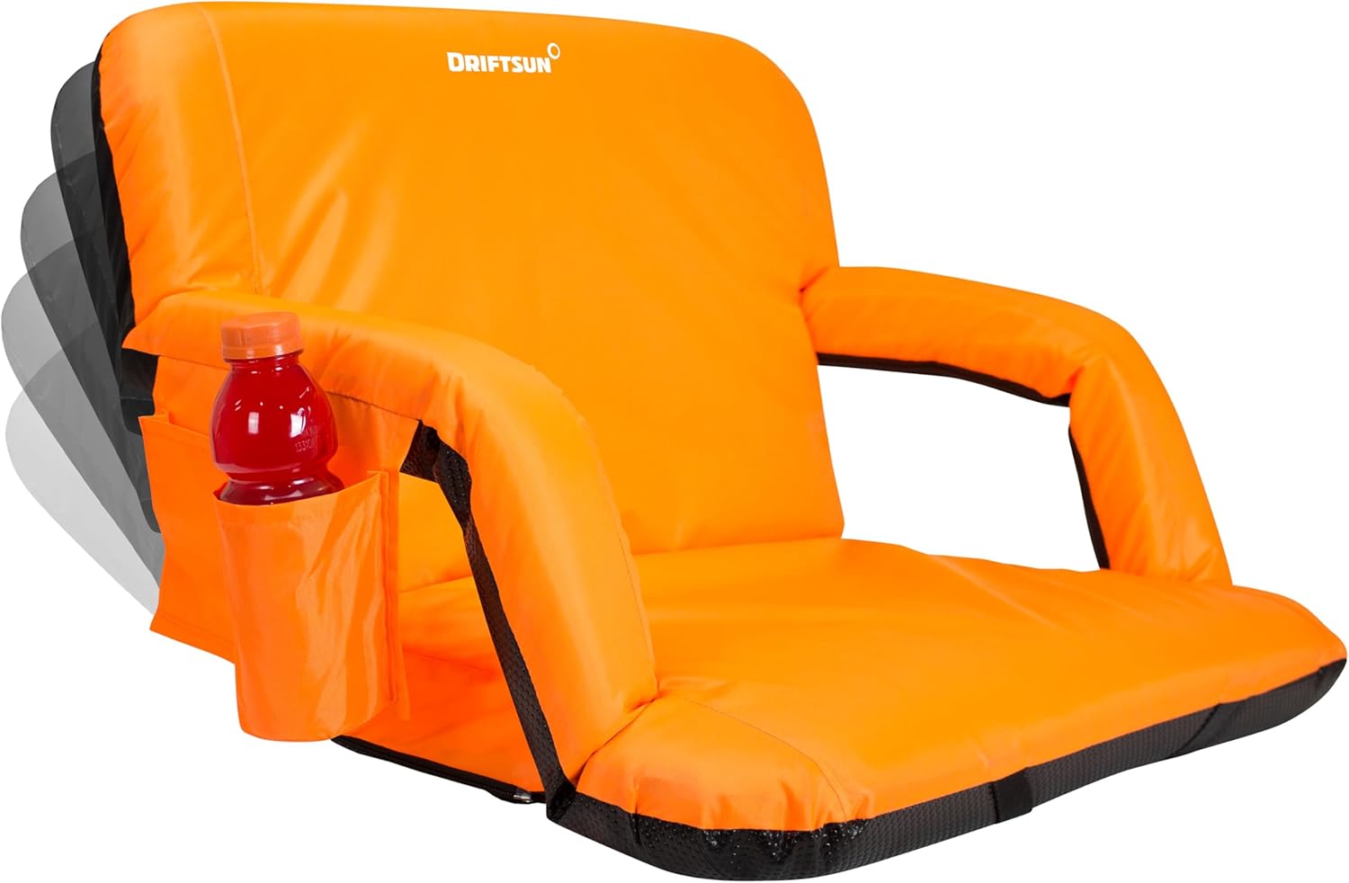 PORTABLE STADIUM CHAIR - The Driftsun reclining bleacher seat with backrest has adjustable backpack straps to transport to the game without the hassle. Perfect for stadium seats, park benches, backyards, and picnics!