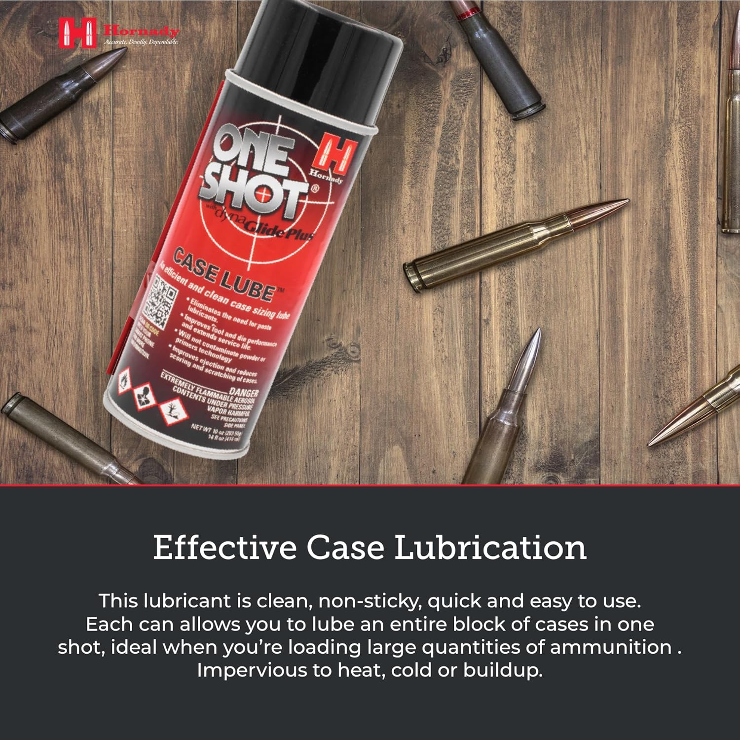 Hornady One Shot Case Lube – Our Hornady Case Lube Spray with DynaGlide Plus technology is an efficient and clean case sizing lube with a micro-penetrating high pressure dry film. 10 oz / 14 fl oz can