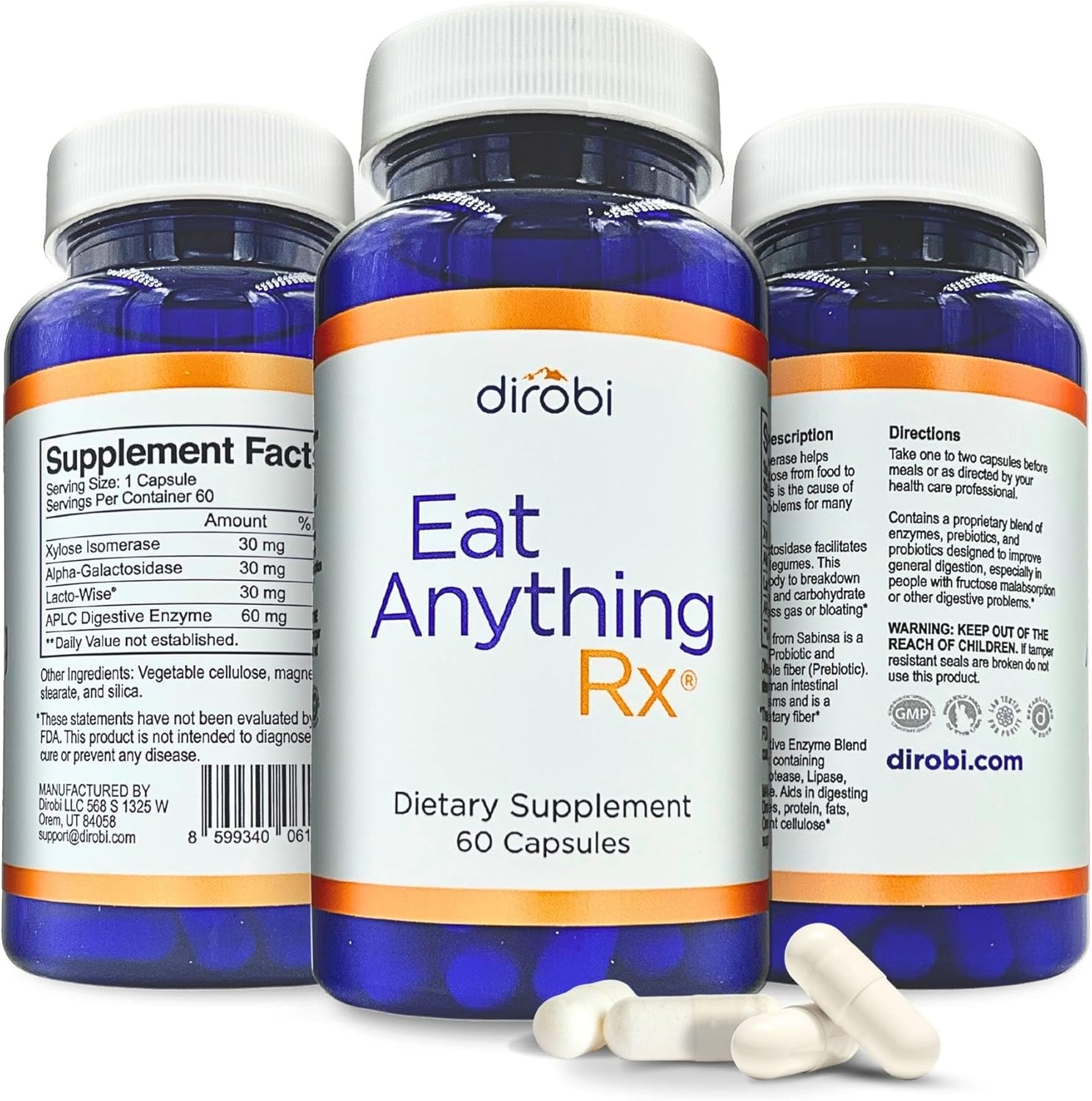 Dirobi Eat Anything Xylose Isomerase Fructose Malabsorption Enzymes, FODMAP Supplement, Digestive Enzymes for Better Lactose, Fat, Protein & Carbohydrate Digestion Gas & Bloating Relief 60 Capsules