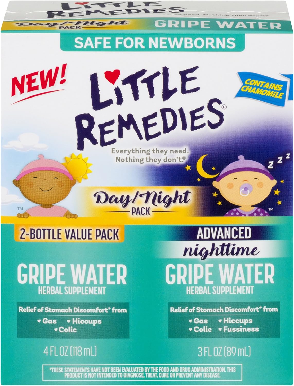 Contains 1 bottle of Little Remedies Gripe Water Day, 4 fl oz and 1 bottle of Little Remedies Gripe Water Nighttime, 3 fl oz