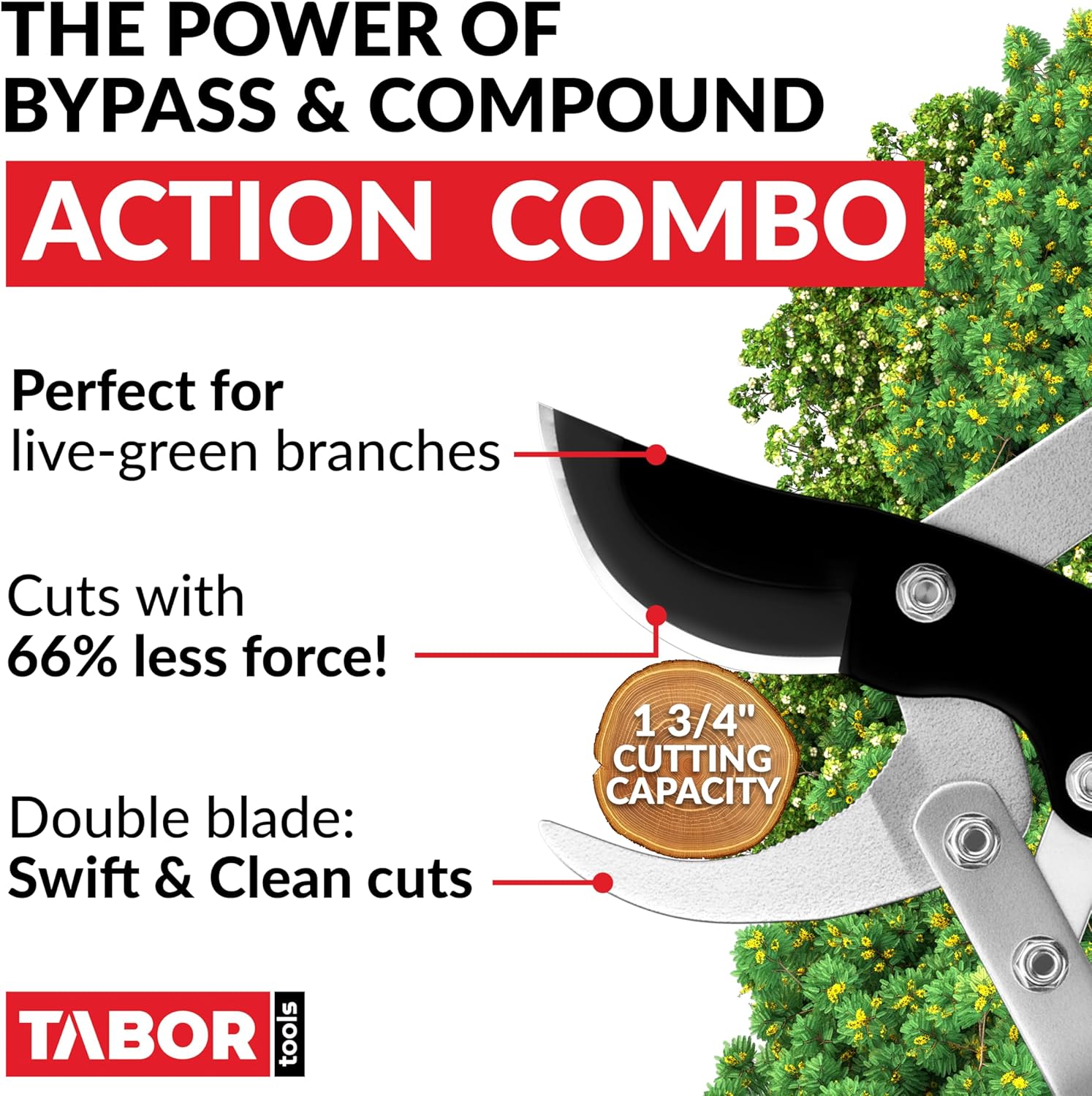 COMPOUND ACTION SYSTEM: The compound lever system with multiple pivot points and moving parts increases the force applied to the blades. The compound action blade has multiple moving parts which efficiently multiplies the force applied to the blades 3 times.