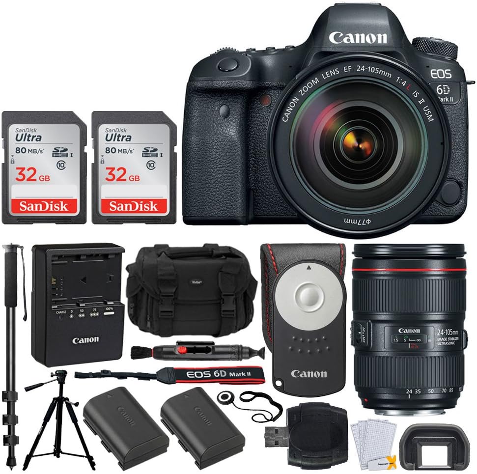 Canon EOS 6D Mark II DSLR Full Frame Camera + EF 24-105mm f/4L is II USM Lens + Canon Battery LP-E6N + Canon RC-6 Wireless Remote + Vivitar Gadget Bag + 72" Monopod + Quality Tripod – Deluxe Bundle