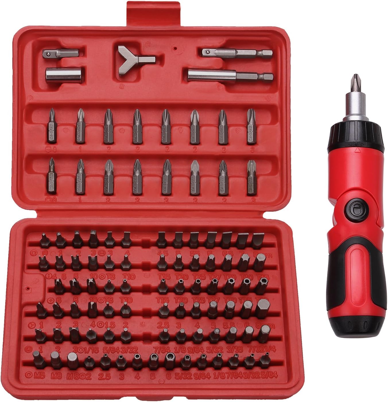 EFFICERE 101-Piece Ratcheting Screwdriver and Security Bit Set is the perfect choice to tighten or untighten all types of screws for your home projects, shop works, contractor jobs, automotive repairs, electronics repairs etc. This complete collection of bits has the types and sizes to fit nearly any fastener out there. It has a full range of security drive type bits that fit tamper-resistant fasteners. Specialized tamper resistant fasteners can show up in unexpected places. Be ready with a full range of types and sizes that fit these unique fasteners. All the bits are made from premium chrome vanadium steel bits with precisely machined tips. They are professionally manufactured to reduce stripping and ensure durability / longevity. This complete set also includes a ratcheting screwdriver with a quick-change magnetic bit holder and three drive positions: clockwise, fixed, and couter-clockwise. The ratchet bit driver features a unique flexible angle head design. You can easily adjust the angle of driver to best fit your application and provide maximum leverage. The 100-pc security bit set in blow molded case includes: 8-pc Phillips: PH#0, PH#1, PH#2 x 5, PH#3; 8-pc Pozi drive: PZ#0, PZ#1, PZ#2 x 5, PZ#3; 9-pc Slotted: 3, 4, 4.5, 5, 5.5, 6, 6.5, 7, 8mm; 9-pc Torx Star: T8, T10, T15, T20, T25, T27, T30, T40, T45; 9-pc Tamper proof Torx Star: T8, T10, T15, T20, T25, T27, T30, T35, T40; 9-pc Metric Hex: 1.5, 2, 2.5, 3, 4, 5, 5.5, 6, 8mm; 6-pc Tamper proof Metric Hex: 2, 2.5, 3, 4, 5, 6mm; 10-pc SAE Hex: 1/16, 5/64, 3/32, 7/64, 1/8, 9/64, 5/32, 3/16, 7/32, 1/4"; 6-pc Tamper proof SAE Hex: 5/64, 3/32, 7/64, 1/8, 9/64, 5/32”; 4-pc Square: S0, S1, S2, S3; 4-pc Spanner: 4, 6, 8, 10; 3-pc Torq: 6, 8, 10; 4-pc Tri-Wing: 1, 2, 3, 4; 3-pc Clutch: 1, 2, 3; 3-pc Spline: 5, 6, 8mm; 1-pc Wing nut driver; 1-pc Magnetic bit holder; 1-pc 1/4" Hex to 1/4" Drive socket adaptor (1” long); 1-pc 1/4" Hex to 1/4" Drive socket adaptor (2” long); 1-pc 1/4” Drive to 1/4” Hex bit adaptor.