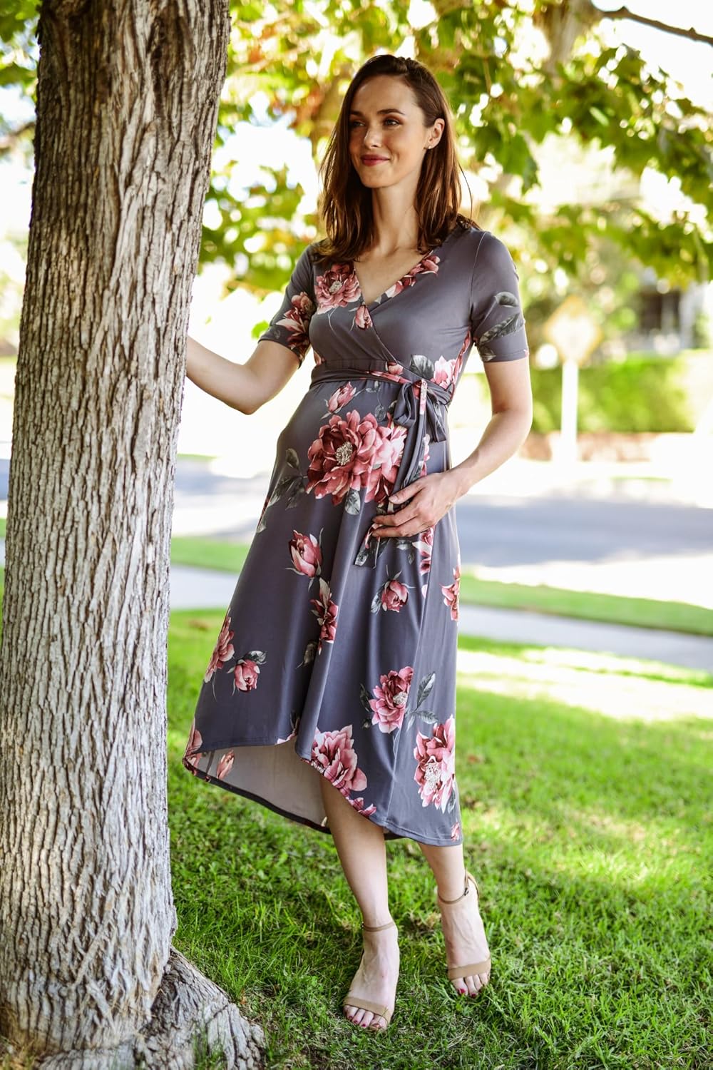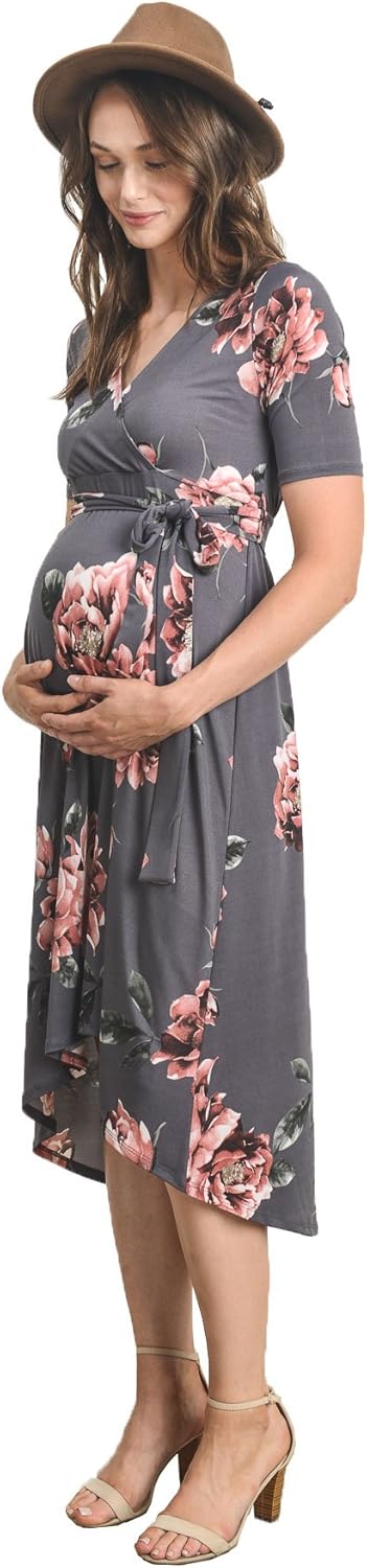 Women's Maternity Wrap Dress Midi Length with Waist Belt