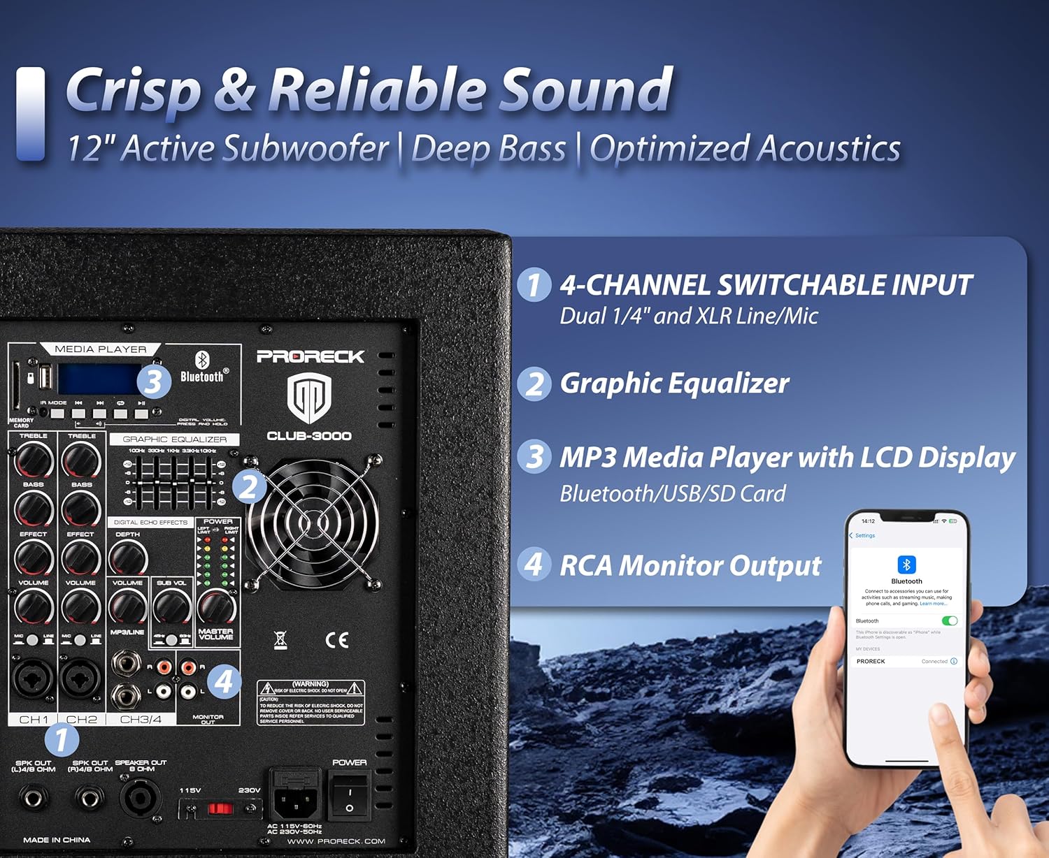 ★ SISTEMA PA PRORECK CLUB 3000: Sistema PA todo en uno de 4000 vatios con Bluetooth que consta de (1) subwoofer activo, (1) subwoofer pasivo, (2) altavoces de matriz de 4x4 pulgadas (totalmente ocho altavoces), (2) soportes para altavoces, (1) cable speakon de 30 pies, (6) cables de 8 pulgadas y 6.35 mm, (1) cable de 6 pies y 6.35 mm, (1) cable de 33 pies y 6.35 mm, (1) control remoto y (1) manual de usuario. El subwoofer activo cuenta con un amplificador de 12 pulgadas y transmite música al altavoz pasivo y a los altavoces de línea para ofrecer música a todas las audiencias.