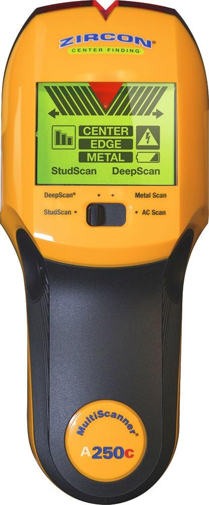 The MultiScanner A250c is Zircon’s newest electronic stud finder, metal detector and live AC scanner with a multicolor LCD screen that is sold exclusively on Amazon. The A250c is designed with a smooth, ergonomic rubber grip allowing for a comfortable yet secure hold for any size hand, at any angle. This multifunctional surface scanner uses the most recent technology in density detecting software and circuitry. The Zircon A250c has a 4-mode selector switch making it easy to change functions while the advanced Color Trip Display allows you to easily distinguish the scanning mode by the color of the screen. The ultra-bright LCD screen, patented SpotLite Pointing System, and audio tone all indicate the location of the target. This Zircon scanner also comes equipped with a Signal Strength Indicator that helps to distinguish between shallow and deep targets. The MultiScanner A250c includes ACT (Auto Correcting Technology) that automatically corrects common user errors, such as when scanning begins over a stud, in addition to a Low Battery Indicator to alert its users to replace its battery for optimal performance results. The tool constantly scans its surroundings and recalibrates itself if necessary. The scanner’s display lights green in its 2 stud scanning modes to locate the center, edges, and direction of wood and metal studs and joists behind walls, floors, and in ceilings. In StudScan Mode, the MS A250c scans up to 0.75 of an inch (19 mm) deep. Switch over to DeepScan Mode to double the scanning depth to 1.5 inches (38 mm). Metal Scan Mode is indicated by a blue screen locates non-ferrous metal, such as copper pipes, up to 1.5 inches (38 mm) deep and ferrous metal, such as rebar, up to 3 inches (75 mm) deep. Metal Scan Mode finds studs behind lath and plaster walls, tile, drywall and stucco walls by identifying the consistent pattern of screw or nail heads in the studs. The A250c is programmed with a Wire Warning Detection feature that indicates the presence of live, unshielded electrical wires up to 2 inches (50 mm) deep when using StudScan, DeepScan and Metal Scan Mode. When live wiring is detected in these three modes, the screen will light, or flash, red. In addition to Wire Warning Detection, the A250c also includes AC Scan Mode that is distinguished by a constant red display. This mode detects, locates, maps, and traces live wires. The Zircon MultiScanner A250c is a perfect choice for serious users, such as home improvement hobbyists and professional contractors. With the Zircon MultiScanner A250c, you can safely maneuver through the most complicated of projects with the professional confidence that comes from owning a Zircon.