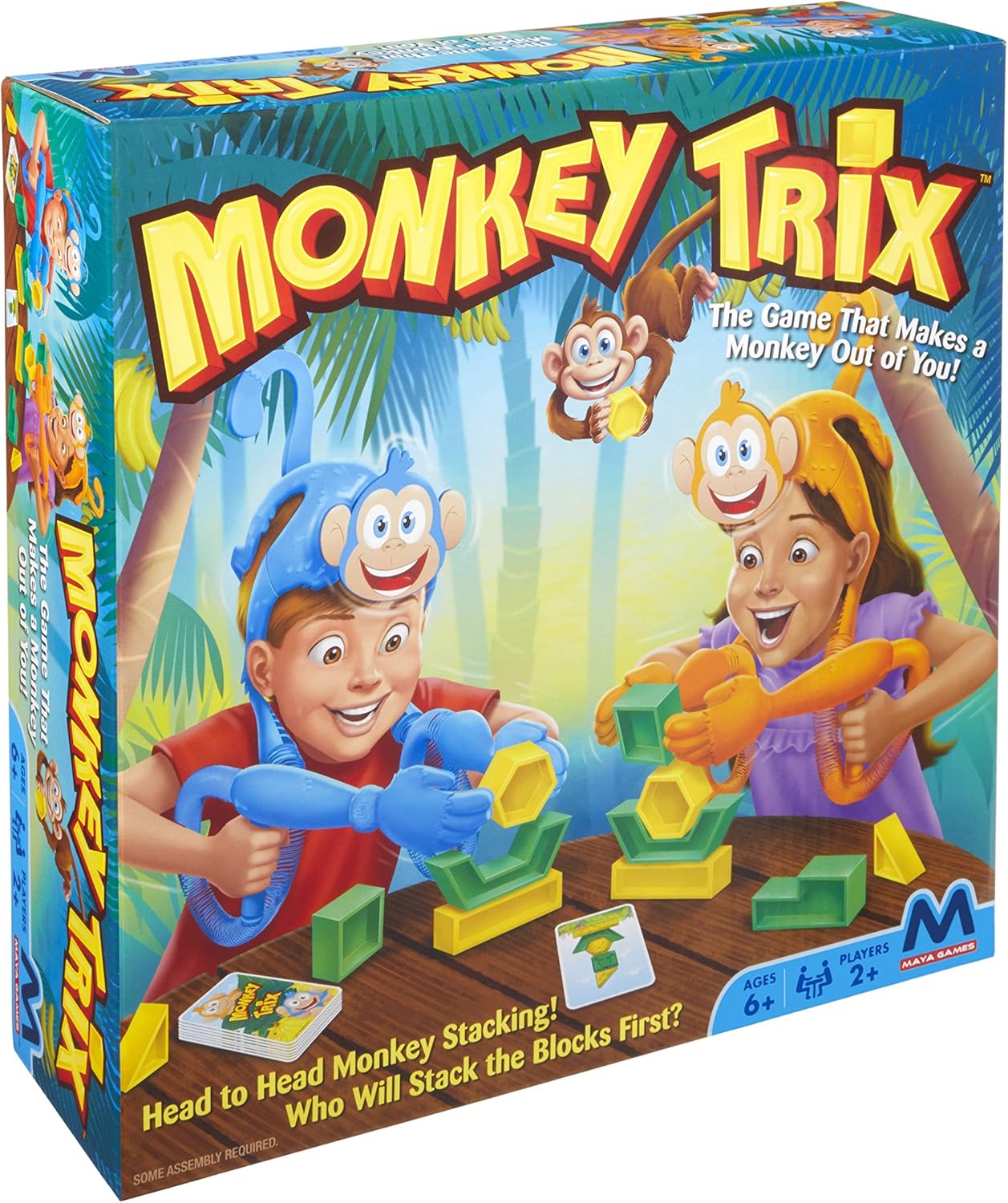 Family game night just got even better! Pick your monkey, collect your blocks and turn over the top card. Be the first monkey to build the stack and take the card to win the round. Collect three cards to win the game. This game is recommended for ages six plus, but friends and family of all ages will love monkey Trix!