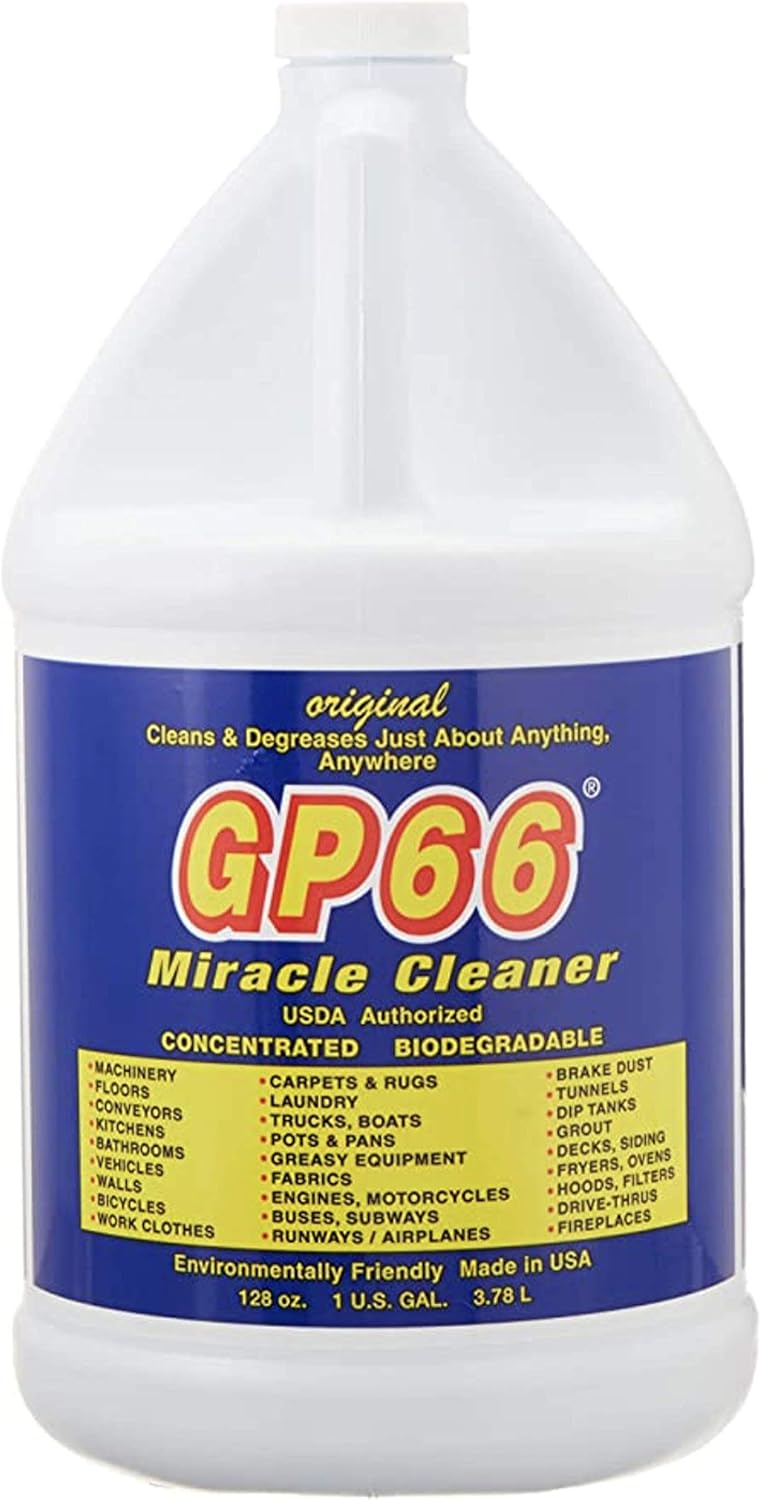SOLUCIÓN SÚPER CONCENTRADA DE UN SOLO USO. GP66 limpia hornos, alfombras, ollas y sartenes, concreto, ladrillo, lechada, lavandería, equipos, microondas, pintura en aerosol, parrillas, tiras de vías respiratorias, grafitis, automóviles, pisos, vino, sangre, suciedad de mascotas, mesas, palos de golf, chimeneas, grasa de tocino, pisos laminados, techos, vinilo, vidrio, muebles, estufas, paredes y más. ¡