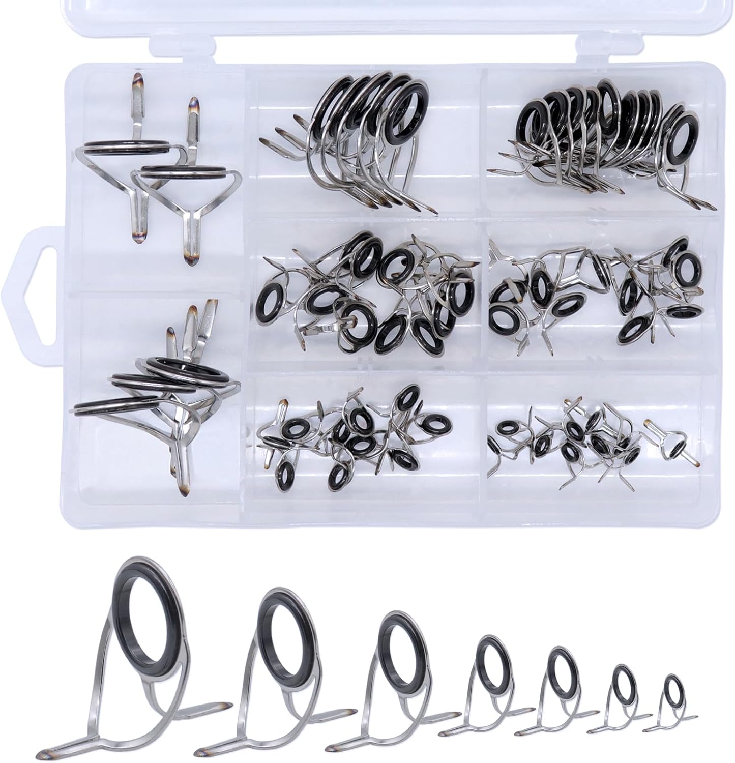 Sizes Available:There are 60 pcs of fishing rod guides 6# 10pcs,8# 10pcs,10# 10pcs,12 10pcs#,16# 10pcs,20# 5pcs,25# 5pcs