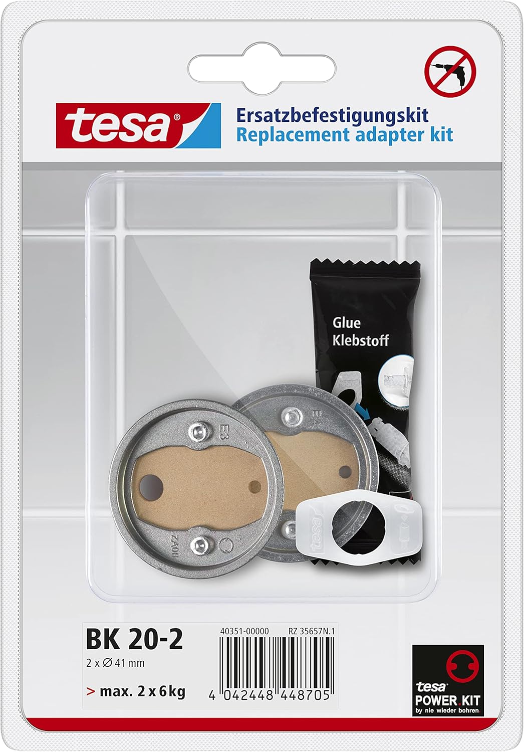 tesa Power.Kit adapter BK20-2, self-adhesive replacement kit, zamak ringDrilling is not needed to put up bathroom accessories, thanks to the tesa Power.Kit adhesive technology. The double adapter BK20-2 makes use of this and is fitted for accessories such as bathroom shelves and bars. The adapters are attached to the wall and filled with adhesive. 12 hours of drying are needed, then any suitable accessory can be fastened with great reliability.Your benefits at a glance:* Any accessory attached with the tesa Power.Kit technology is easy to take down without a trace at any time. * With this replacement adapter kit BK20-2, said accessory can be simply put up again in a new location* Used for example in the tesa series Ekkro, Luup, Klaam and Smooz* Includes: 2 x adapter, 1 x tube of high performance adhesive, 1 x tube squeezing aid* The tesa Power.Kit technology is "made in Germany," guaranteeing a secure and enduring hold.This double adapter kit for example serves for the single and double towel bars or glass shelves in the tesa series mentioned above.Convenient to put up:1. Clean the intended spot using a cloth with water or pure alcohol. Only then can the adhesive reach its top strength.2. Attach the adapters to the accessory. Peel off the protective films and stick them to the wall.3. Disconnect the accessory. For each adapter, fill adhesive into the larger hole until it starts to come out the smaller hole.4. Allow 12 hours for the adhesive to harden. Fasten the accessory to the adapter with an Allen key. Both accessory and adapter are simple to remove cleanly. Detach the accessory. Use pliers to twist the adapters off the wall. Scrape off any remaining adhesive. With the tesa adapter BK20-2, you can benefit from all the advantages of the tesa Power.Kit technology!