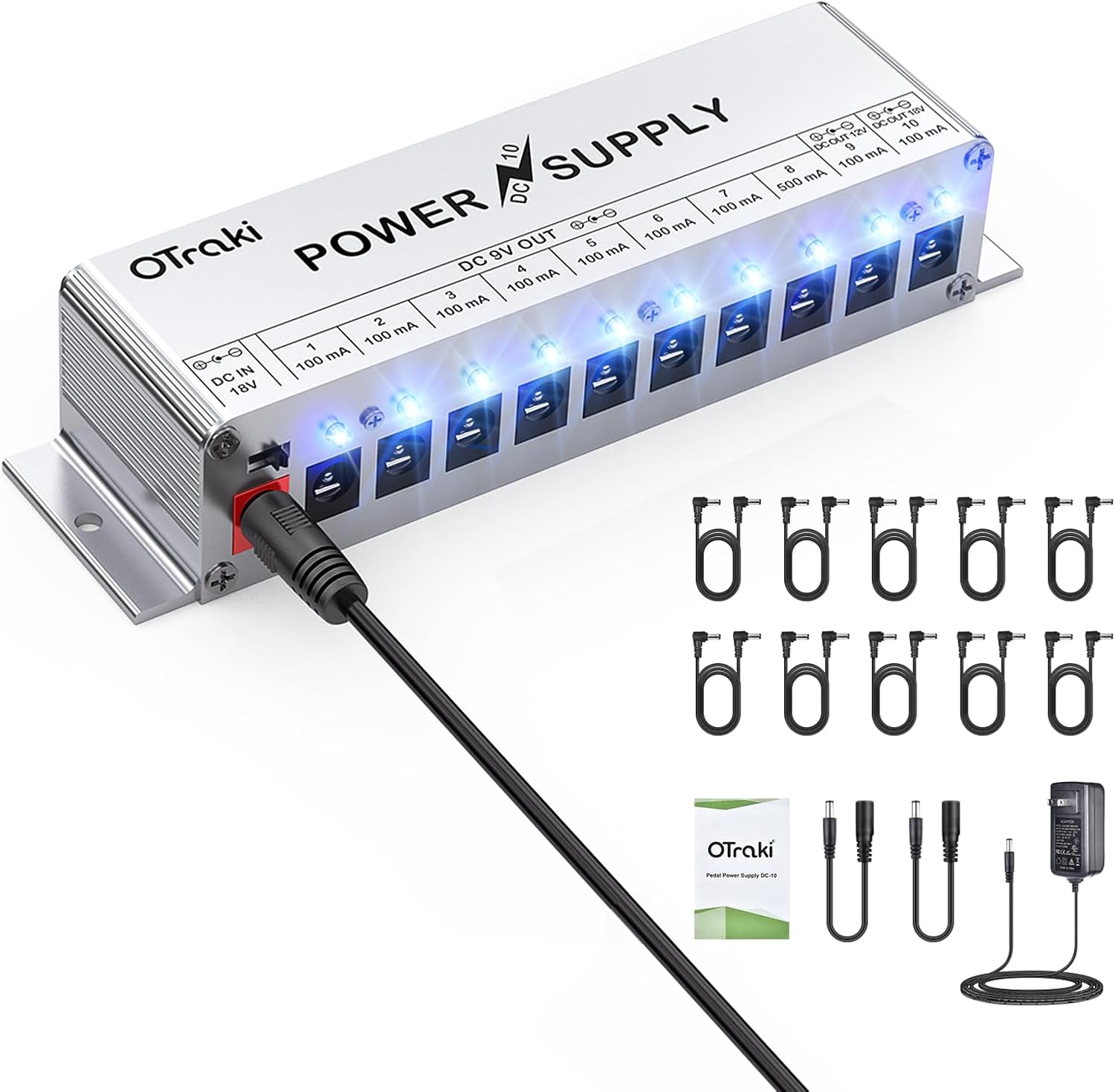 10 INDIVIDUAL OUTPUT: OTraki guitar pedal power supply is designed for effect pedals. With 10 isolated output: 9V 100mA port x 7, 9V 500mA port x 1, 12V 100mA port x 1, 18V 100mA port x 1. Short circuit in one channel won't affect other channels' function.