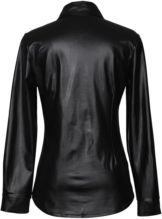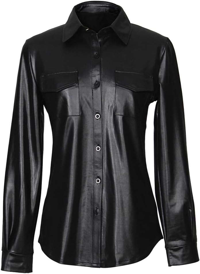 Sorrica Womens Sexy Shiny Metallic PU Faux Leather Nightclub Styles Long Sleeves Button Down Shirts Top
