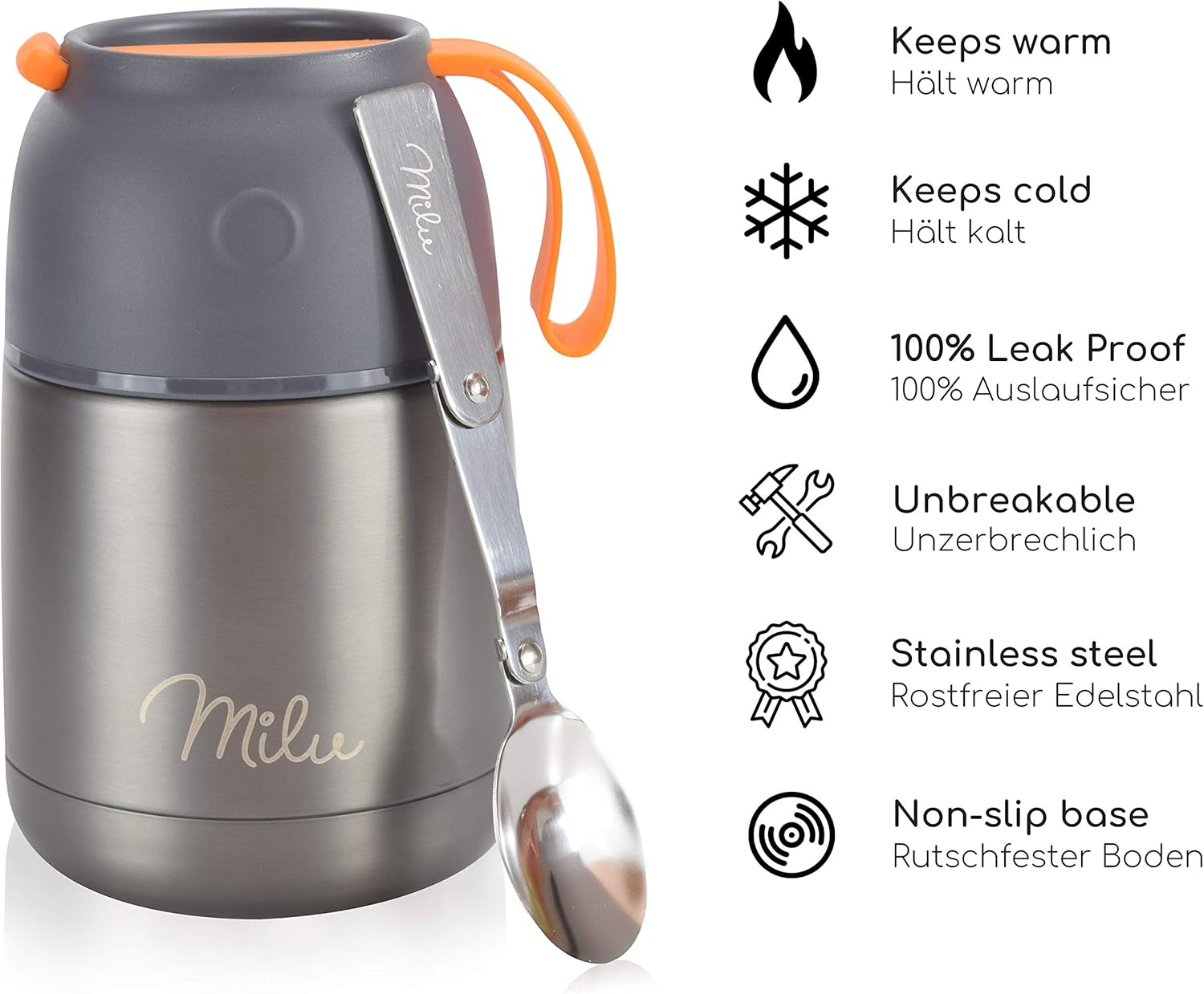 Milu Thermo Food Jar with folding Spoon 15 oz / 22 oz Double Wall Insulated Stainless Steel Food Containers Wide Mouth Lunch Box for Hot & Cold Food – Grey/Orange 15 oz