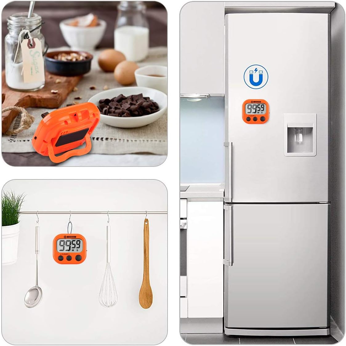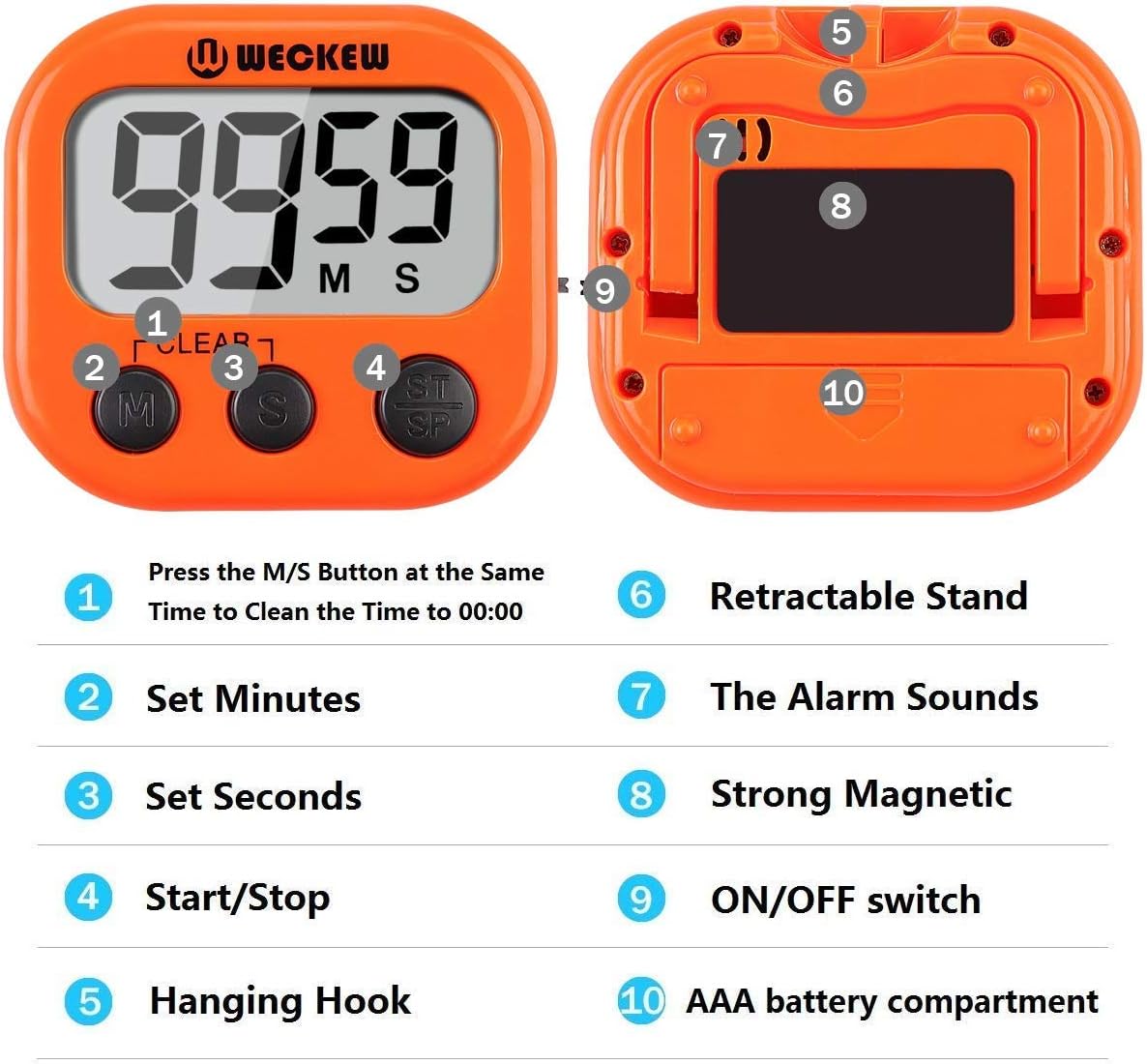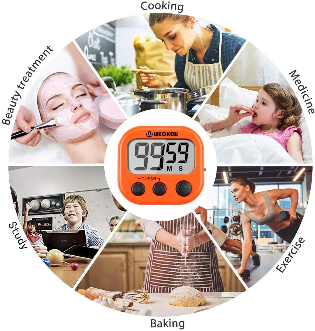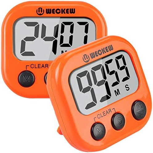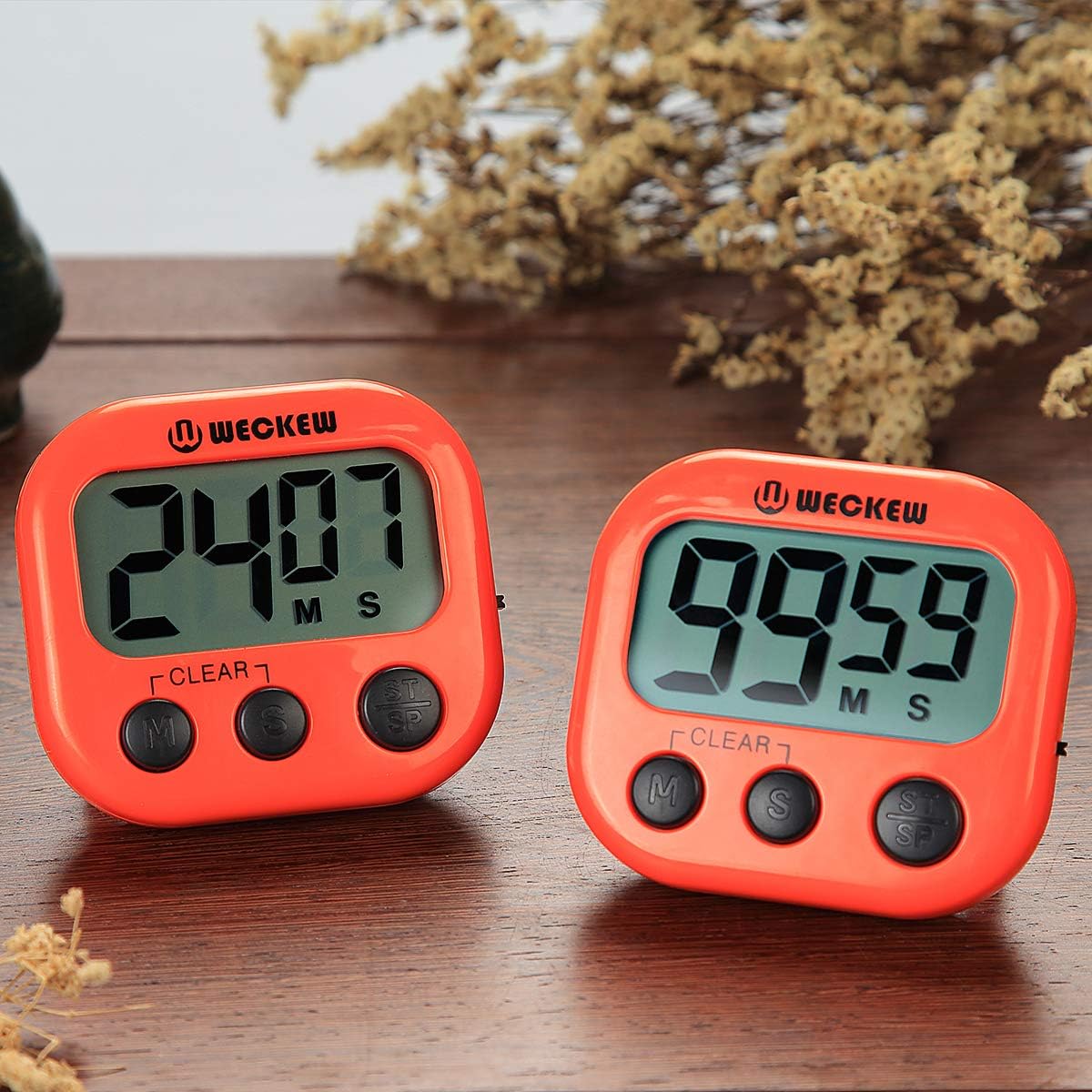 Simple design makes cooking that whole lot easier We all know how important it is to cook our food for the right duration, unfortunately many of us, especially as we grow older find it hard to keep track of how long a piece of meat has been cooking for, and low and behold, before we know it the whole thing is smoking. The best digital timer for your needs The weckew kitchen timer is attractive looking and easy to use timer to prevent such catastrophes from happening. Sure, most modern cookers do have timers but the digits are usually small to read, the alarm not so loud and you cannot move the timer to the next room to keep an eye on it. timer can count up and down so can be used as a stopwatch as well as a countdown timer, ideal for cooking food, homework, gym workout, sports, games, time out (for kids), office and classroom timer activities. The maximum time Set is 99 minutes and 59 seconds. The timer will remember the last setting, which is useful for repetitive activities. Product features large digits> counts up and down (maximum 99 minutes 59 seconds) loud, audible alarm magnetic backing and retractable stand attractive Design very easy to use memory (remembers last setting used) specifications time units: minutes (M), seconds (s) maximum time: 99 minutes, 59 seconds> alarm sound duration: 60 seconds size: 2.83 x 2.56 x0.75 inches power: 1 x AAA battery (not included) package contents 2 x digital timer 2 x user manual