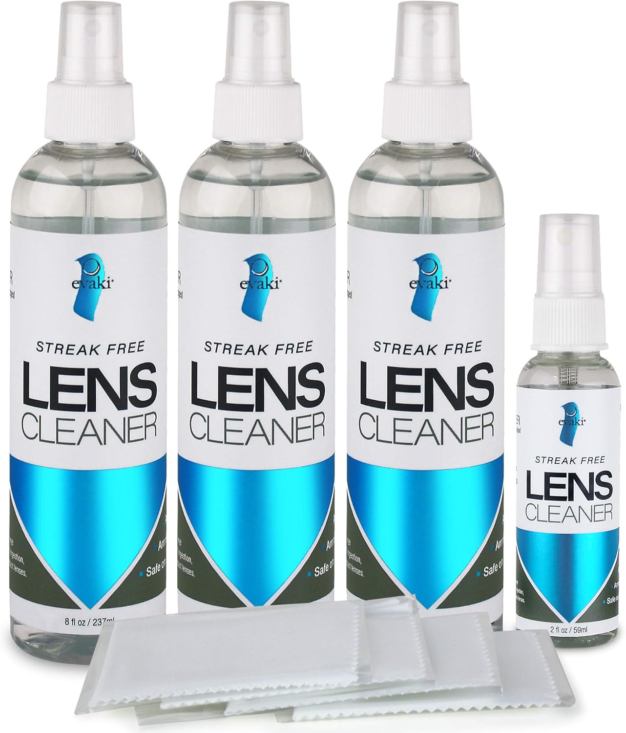 Alcohol and Ammonia-Free Evaki Lens Cleaner Bundle; Streak Free Cleaner Safe for All Lenses; 4 Bottles (3-8oz, 1-2oz) + 4 Microfibers