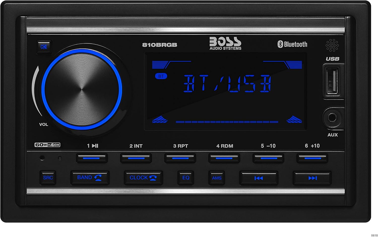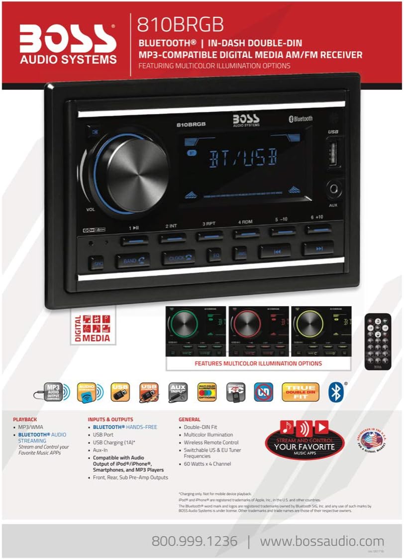 Listen to all your favorite music with the BOSS Audio 810BRGB double-din Mech-less (No CD/DVD), AM/FM radio receiver, Digital MP3 player. Connect your smartphone or MP3 player to the Auxiliary input, turn on the AM/FM radio or plug into the USB port for more music options. You can also charge USB devices with the USB port. Bluetooth technology lets you play and control music apps like Pandora and Spotify and make calls hands-free. Choose your sound style with the built-in preset EQ and change the color with the multi-color illumination options.