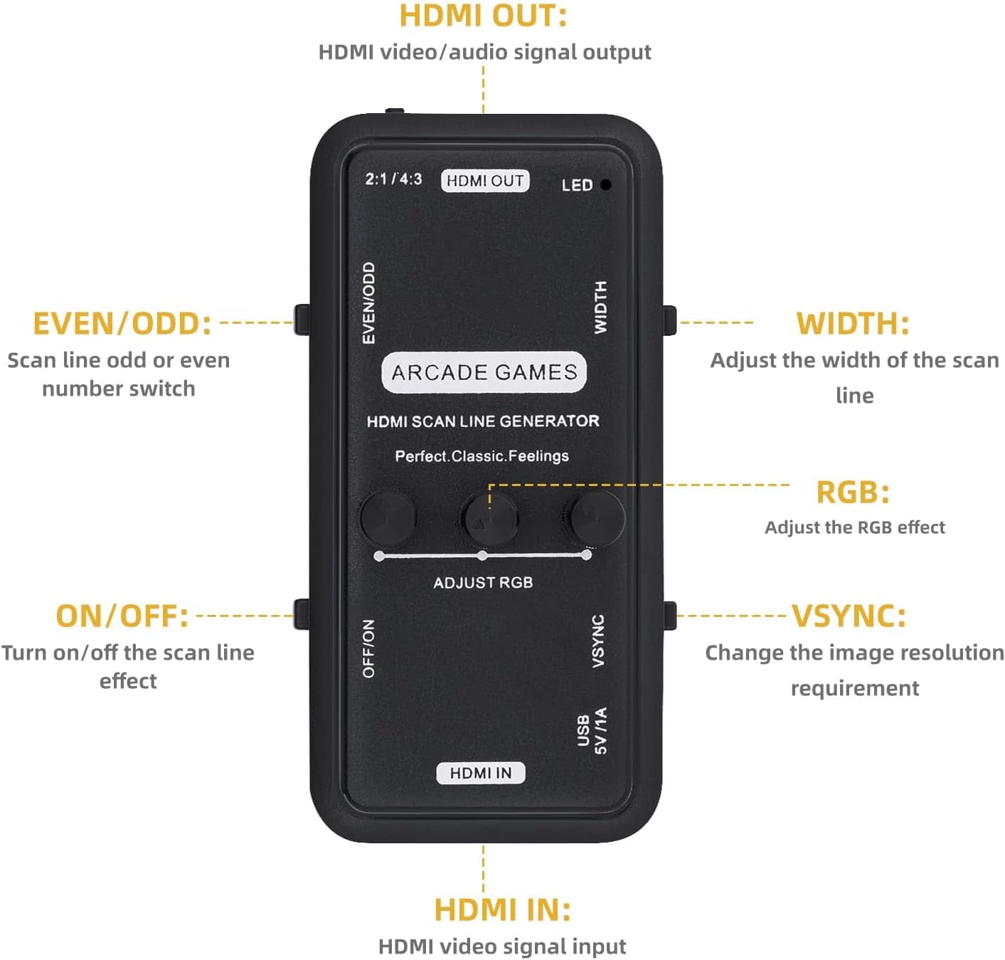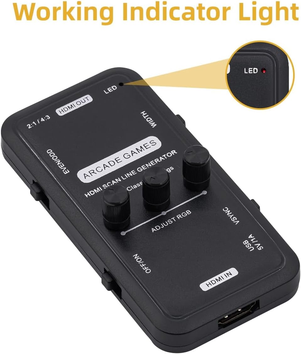Descripción: Función del Generador de Líneas de Imagen HDMI: El video del juego de arcade produce el efecto de línea de escaneo,clásico,nostalgia,Recuerdo perfecto de CRT.Efecto de visualización de imagen de video de 15KHZ,Revivir la imagen clásica del juego de arcade,Siente de nuevo la maravillosa imagen de la línea de escaneo.Descripción del interruptor de función del generador de líneas: A:HDMI OUT(Interfaz de Salida de Señal de Video/Audio HDMI). B:HDMI In(Interfaz de Entrada de Señal de Video HDMI). C:EVEN/ODD--->Interruptor de número impar o par de línea de escaneo . D:WIDTH--->Interruptor de Anchura(Líneas de escaneo duales o individuales). E:ON/OFF--->El interruptor total del efecto de línea de escaneo. F:VSYNC--->Interruptor de adaptador de resolución de imagen(Cambia el requisito de resolución). G:R G B--->Depuración de rojo verde azul(Principalmente a través de tres potenciómetros de depuración del efecto). Descripción de las señales verticales: 1.Si el interruptor de línea de escaneo está ENCENDIDO, la línea de escaneo no tiene efecto(imagen más oscura), esta señal vertical está fuera de sincronía. 2.Si necesita el efecto de línea de escaneo, cambie (VSYNC) para sincronizar, resultando en efecto. 3.Si no necesita el efecto de línea de escaneo, el interruptor está configurado en APAGADO, la imagen se restaura al estado normal VGA.(La imagen más oscura restaurará el brillo). Operación: - ON/OFF-Puede abrir o cerrar fácilmente la línea de escaneo sin quitar la placa. - La intensidad de la línea de escaneo se puede ajustar finamente con tres resistencias ajustables en el escáner. Contenido del paquete: 1 x Generador de Líneas de Imagen
