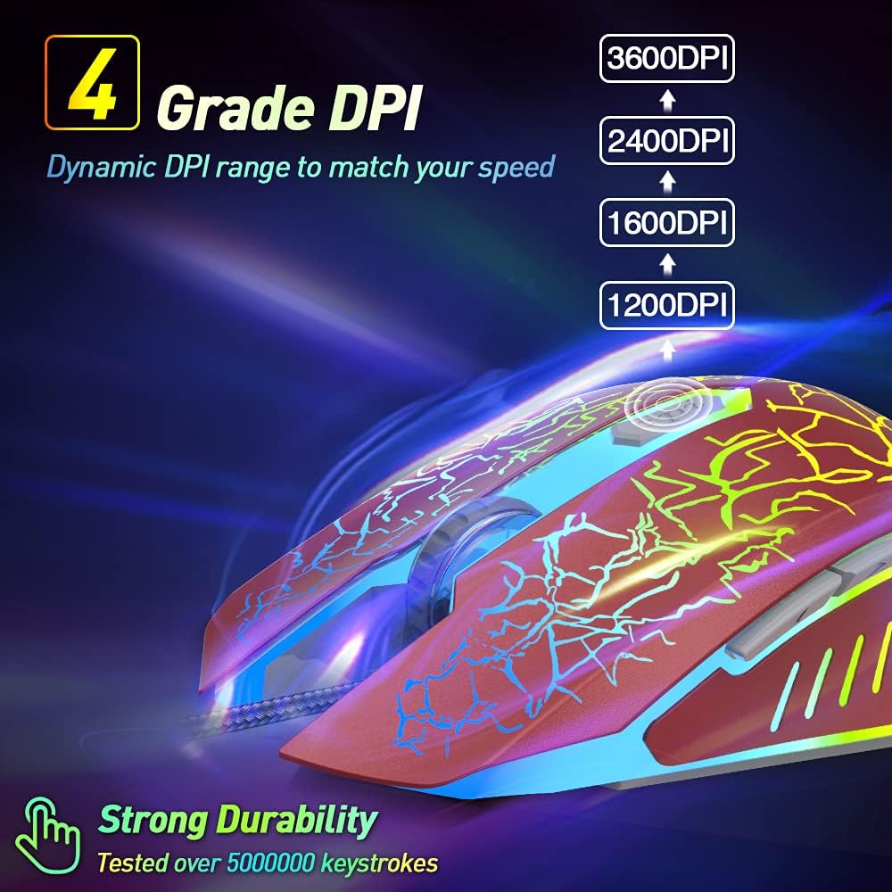 【4 DPI Options for Games & Work】 1200/ 1600/ 2400/ 3600 DPI Resolution Optical Tracking Technology provides sensitivity and precise tracking on a wide range of surfaces. Meet your multiple needs, either for daily work or gaming.