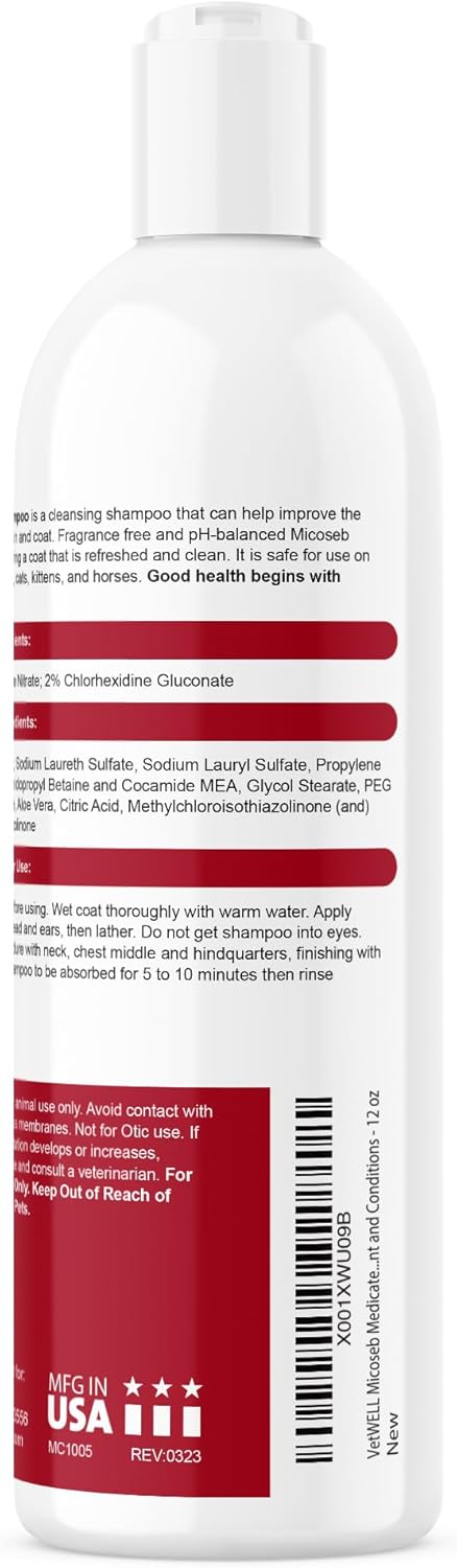 Micoseb Shampoo is a cleansing shampoo. Fragrance-free, and pH balanced, Micoseb Shampoo is a cleanses and leaves the coat refreshed and clean. It is safe for use on dogs, puppies, cats, kittens and horses. Good health begins with VetWELL.