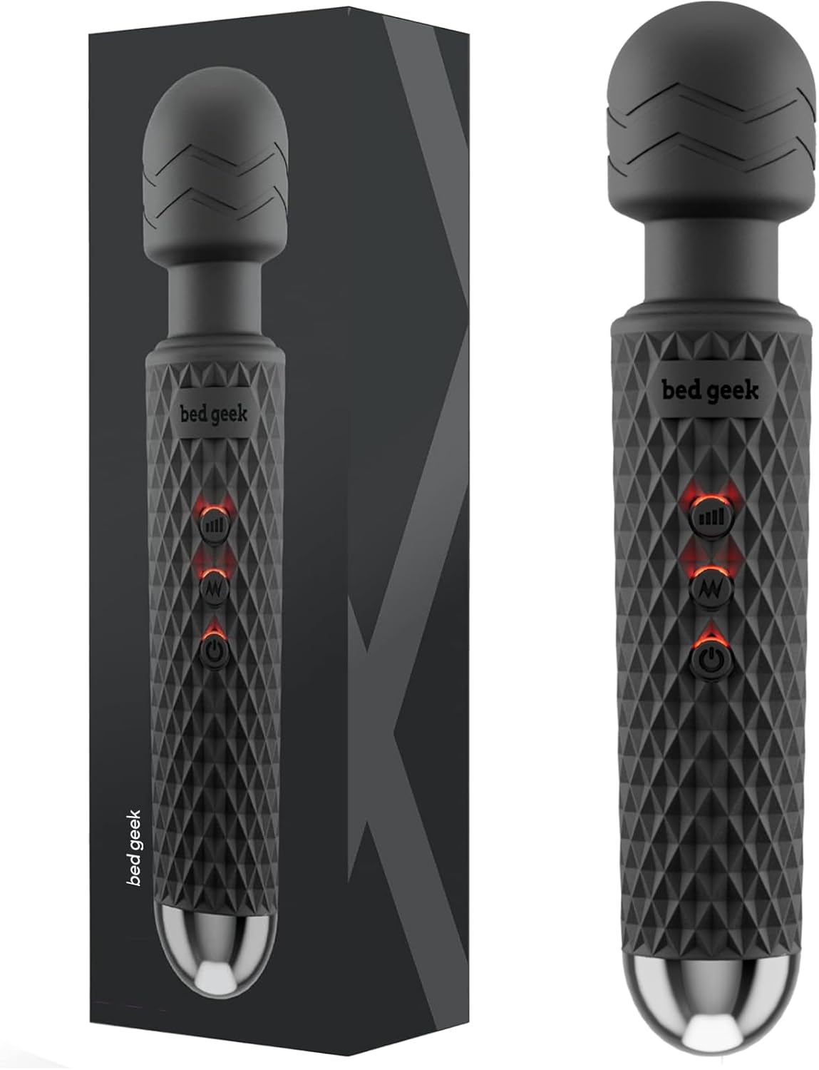 bed geek Handheld Cordless Personal Wand Massager – Waterproof, USB Rechargeable, 20 Vibration Patterns, 8 Speeds, Memory Feature, Skin-Soft Silicone for Ultimate Relaxation Tool (Black)