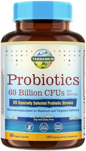 Terranics Probioticos 60 Mil millones de UFC, 20 Cepillos, 60 Cápsulas Veg, Prebioticos & Probioticos, Suplemento Probiótico Estable en Estante para Hombres y Mujeres, Salud Digestiva e Inmune, No-GMO, SIN Soja, Lácteos y Gluten