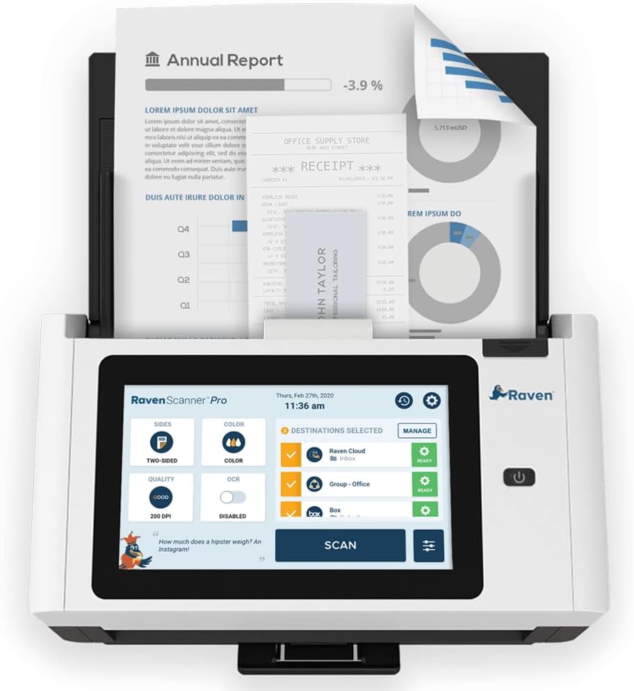 Escáner de documentos Raven Pro: pantalla táctil enorme, alimentador dúplex a color (ADF) de alta velocidad, escaneo inalámbrico a la nube, WiFi, Ethernet, USB, escritorio para el hogar o la oficina