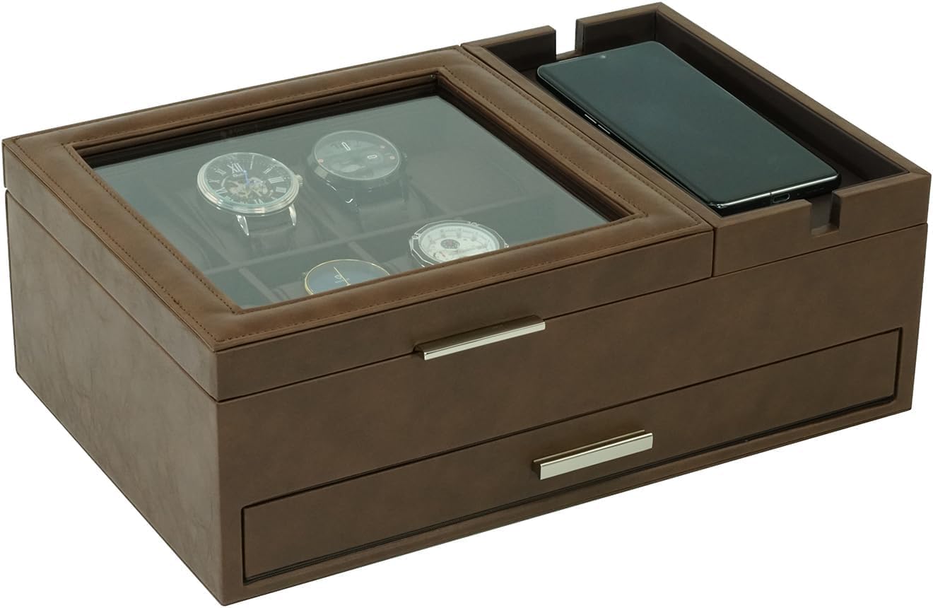 Mens Jewelry Box Valet Tray with Drawer and Charging Station Organizer -Brown