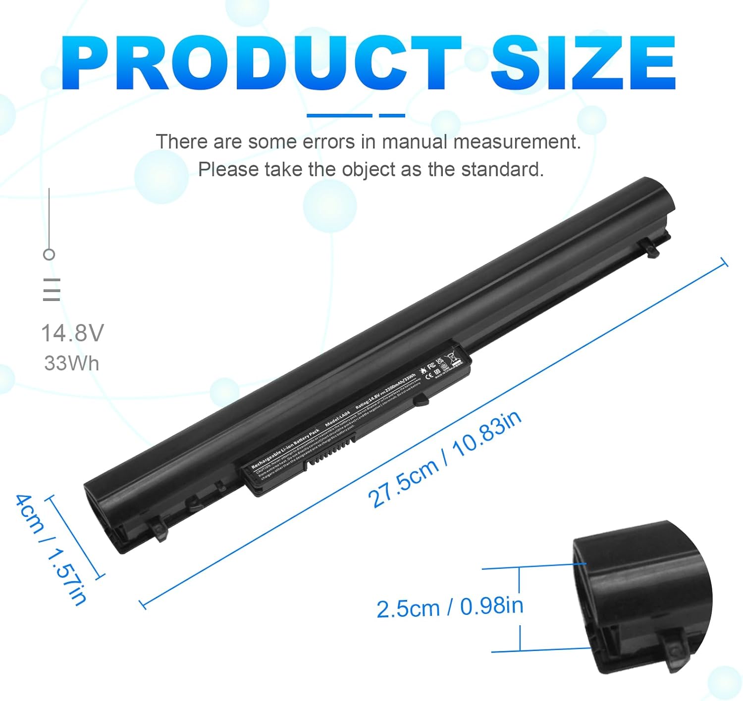 Battery Type: Li- ion; Voltage: 33wH/2200MAH/14.4V (Compatible with 14.4V) Compatible List: 4 Cell Spare Battery for HP Pavilion 14 15 Notebook TouchSmart PC series We only use grade A battery cells that provide up to 500 charging cycles.