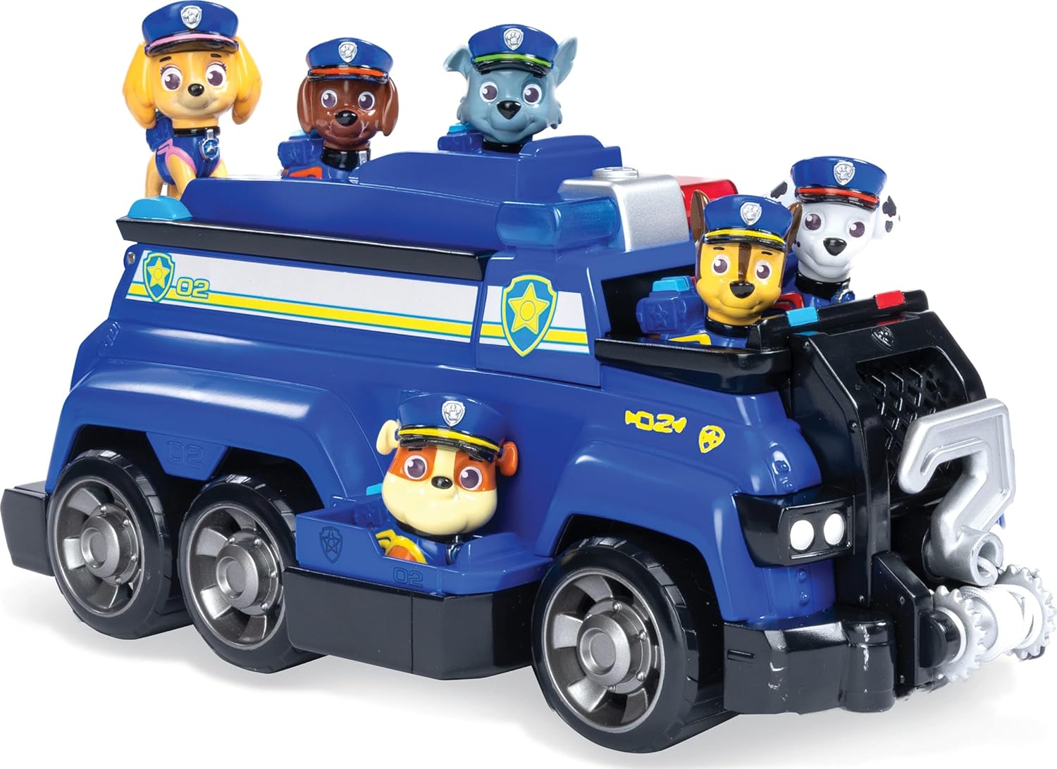 ¡Prepárate para un rescate total en equipo con el crucero policial del equipo de Chase! ¡Este vehículo de equipo definitivo incluye a los seis cachorros de la Patrulla Canina, vestidos con uniformes de policía a juego para un juego de rescate completo! Con espacio para los seis cachorros del vehículo, cárguelos y corra al rescate cuando surjan problemas. El Team Police Cruiser de Chase viene equipado con todo lo que necesitas para salvar el día: subir la cabina del conductor y estar atento; extender la barandilla de protección para controlar el tráfico; levantar la puerta trasera con espacio para un cachorro en el interior; y sacar el cabrestante que funciona para mover objetos y rescatar a los ciudadanos de Adventure ¡Bahía! Con los seis cachorros trabajando juntos como un equipo, ¡están listos para cualquier cosa! Con detalles realistas, el Team Police Cruiser de Chase da vida a toda la emoción y la acción del exitoso programa de televisión. ¡Lleva a los cachorros a las mejores misiones de rescate en equipo con el crucero policial del equipo de Chase!