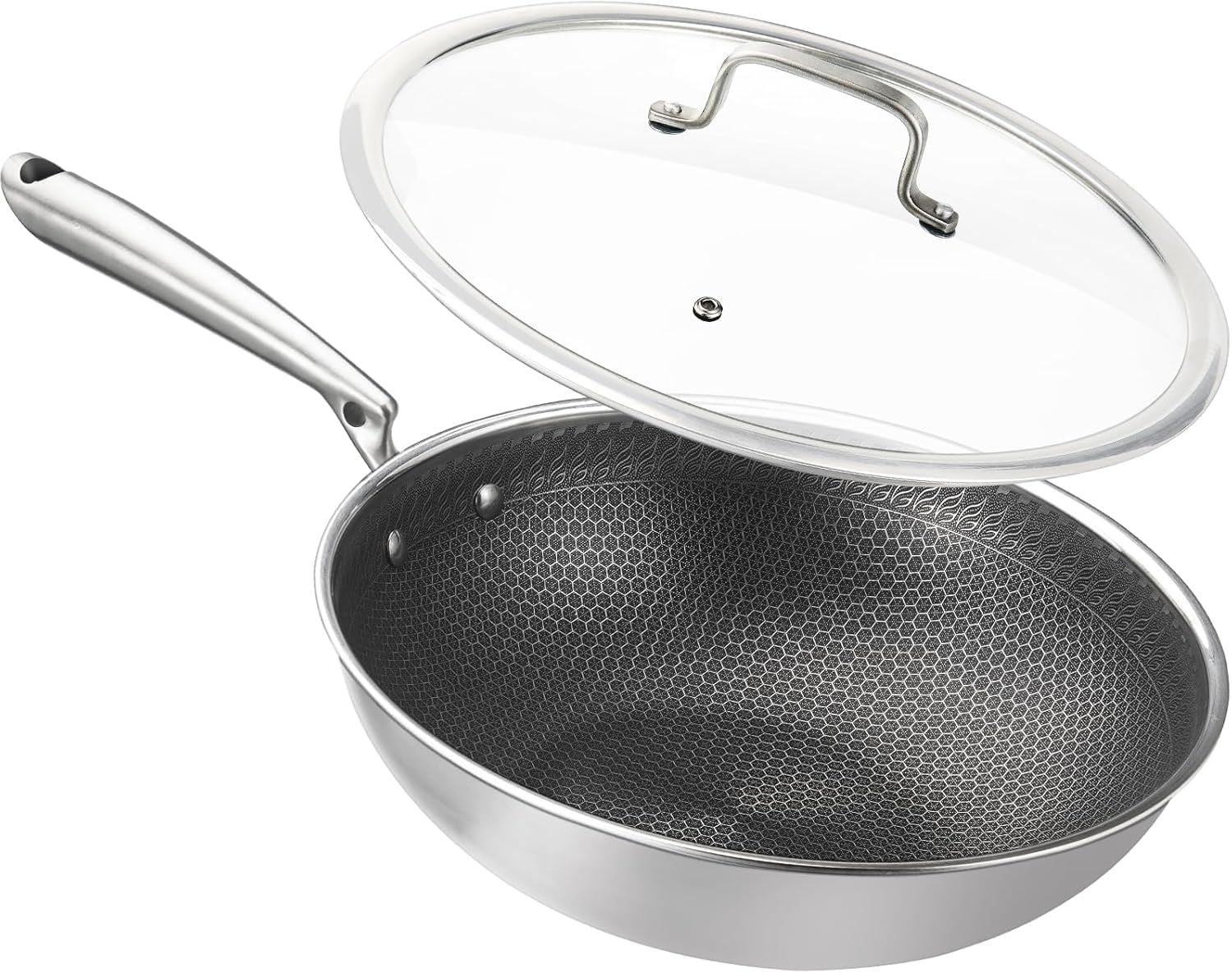 Potinv Hybrid Stainless Steel Wok with Stay Cool Handles 12 Inch,Non-Stick, Dishwasher and Oven Safe, Works with Induction, Ceramic, Electric, and Gas Cooktops