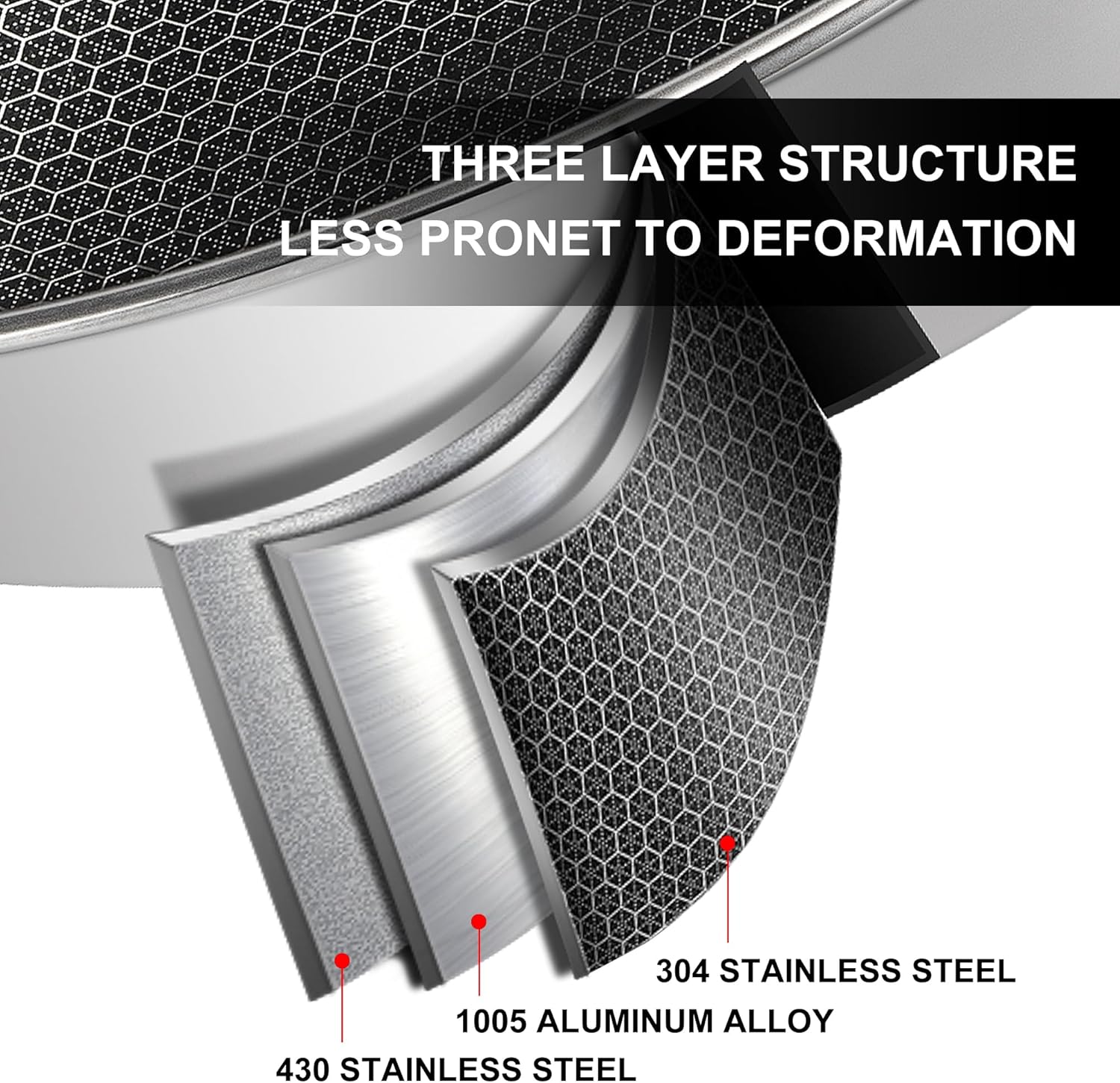 POTINV PATENTED TECHNOLOGY: The hexagon design is created through a laser etching process to provide both stainless steel and non stick surface. This dual surface allows your large wok sear still while using less oil, grease, and butter.