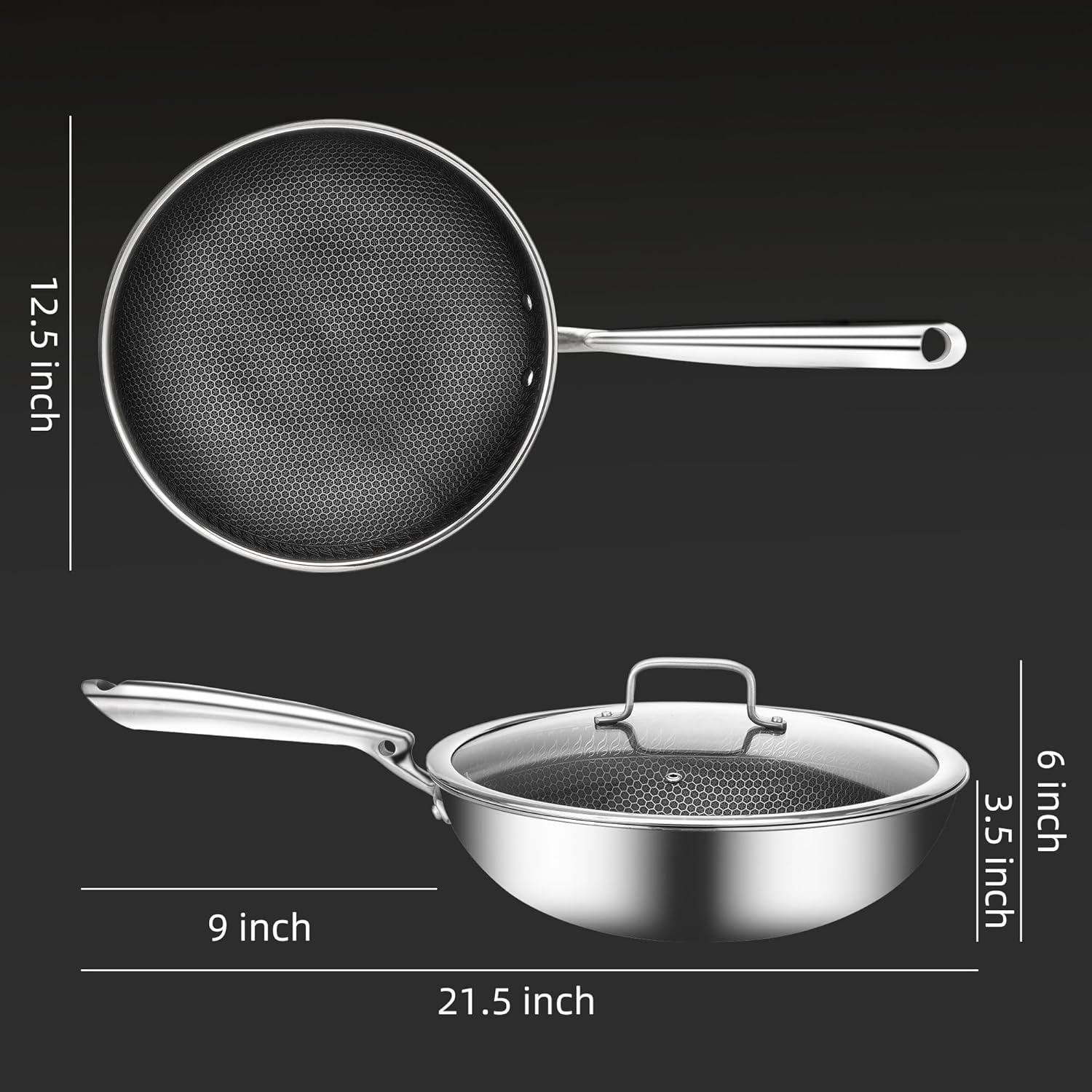 HIGH-QUALITY MATERIALS: To create a durable nonstick wok built to last requires a tri-ply construction. The first and third layer is stainless steel for sturdy non-stick features, while aluminum in between conducts consistent, even heat distribution.It features stay-cool handles for a premium cooking wok experience.