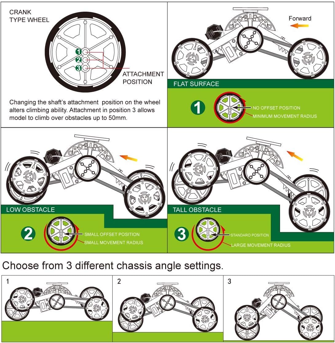 CLIMBING VEHICLE: 4WD car model,changing the rivet positions in the angle adjuster will change it's height,and climbs over obstacles up to 50 mm with easy