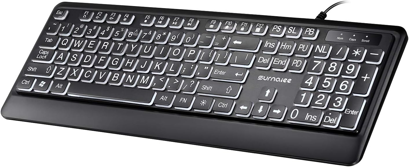 SurnQiee Teclado de impresión de letras grandes, 104 teclas, tamaño estándar, USB, con cable, retroiluminación LED blanca (KB612)