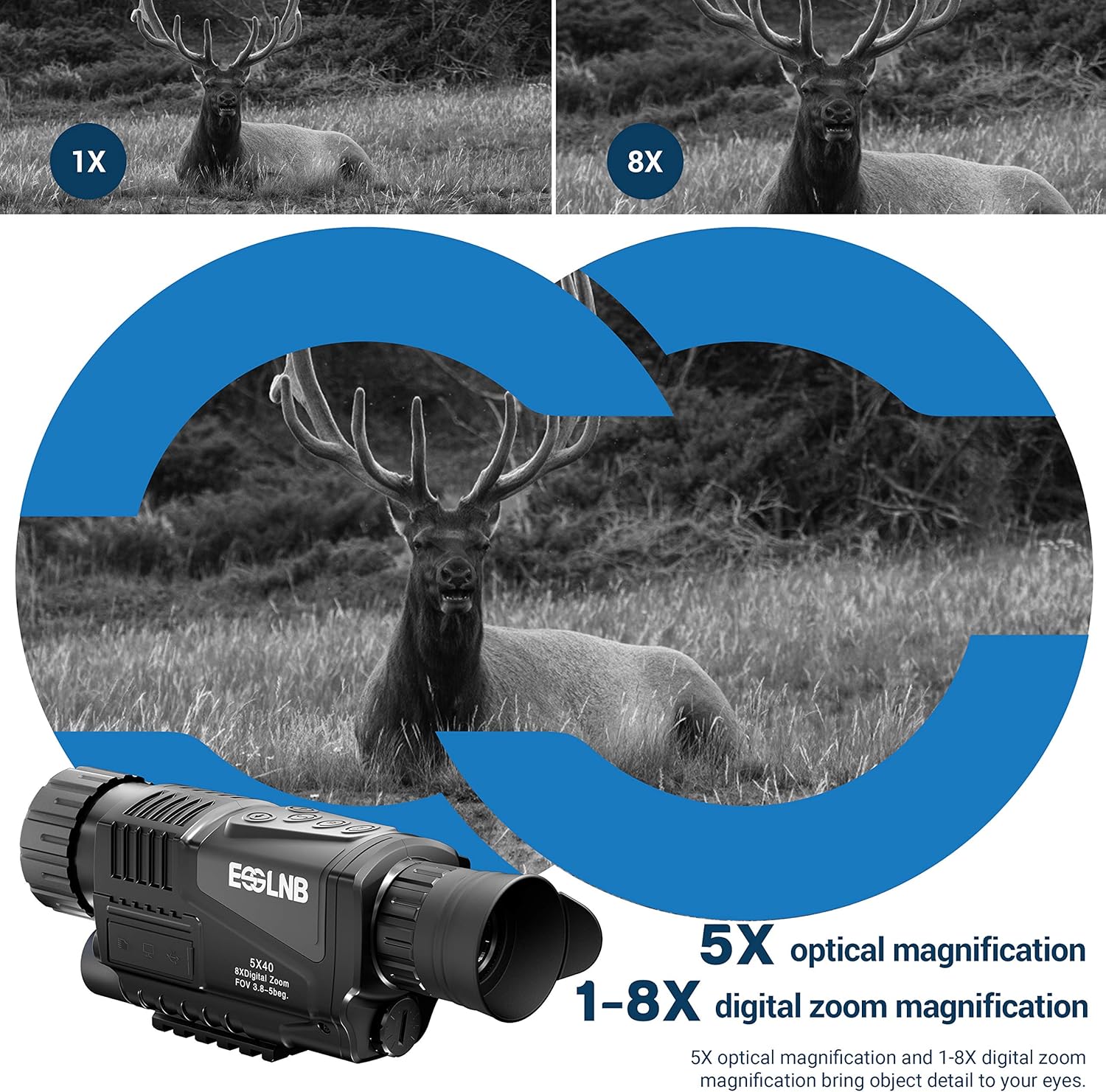 Digital monocular with 5X optical magnification and 1X-8X digital zoom gets closer to your target. Night vision monocular with 40mm objective lens and fully-multi coated optics achieves clear view. CMOS high sensitivity sensor and CCD auxiliary lighting keep the image clear and bright. The infrared illuminator turns on automatically under completely dark conditions. During daytime or weak light, observation distance is infinite.