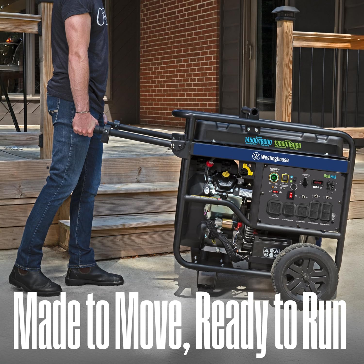 For your toughest power needs, the Westinghouse WGen14500DF dual fuel portable generator produces up to 18,000 peak watts and 14,500 running watts and runs on gasoline and propane for flexibility. The heavy duty 713cc 4-Stroke OHV Westinghouse V-Twin engine has a cast iron sleeve and runs for up to 16 hours at 25% load on a 10.5 gallon gas tank, keeping you powered all day or night with a built in fuel gauge and automatic low oil shutdown. There is one 120/240V 14-50R 50A outlet and one 120/240V L14-30R 30A outlet. Both are transfer switch and interlock kit ready so they can power major appliances like air conditioners, refrigerators, sump pumps, as well as lights and entertainment centers at once with a single cord hookup. It also has a 120V L5-30R 30A outlet, two GFCI 120V 5–20R 20A standard duplex outlets and two USB ports. At less than 5% THD, you can safely power electronics like computers, phones and TVs. Copper windings help the unit produce cleaner power, run cooler and last longer. Push button electric start and remote start make powering up easy. A VFT data center shows voltage output, frequency and lifetime hours for real time information and maintenance alerts. Easily portable with never flat wheels, steel handles and lift bar, it’ll have your house, travel trailer or jobsite powered in seconds. Backed by a 3 year limited warranty, lifetime tech support and our Westinghouse Nationwide Service Network.
