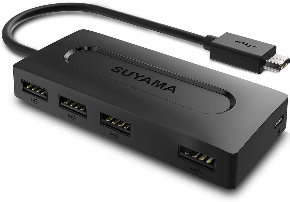 Visión general Diseñado por SUYAMA para agregar 3 puertos USB a su dispositivo host para conectar teclados inalámbricos, mouse, unidades flash USB, adaptador USB ethernet, HDD, SSD, controladores de juegos o cualquier otro periférico USB mientras continúa alimentando su dispositivo. (NOTA: NO es compatible con carga y OTG simultáneamente si lo usamos para teléfonos inteligentes o tabletas). Destacados Micro USB a USB 2.0 Hub con suministro de energía, puede usarse para cargar baterías y transferir datos. Conexión estable y mejorada para un uso duradero. pasó la prueba de tensión de tiro. Fácil de configurar - Sin necesidad de instalar ningún programa de controlador para el adaptador ethernet, simplemente enchufe y listo. Delgado y portátil - Con un tamaño delgado y portátil, el adaptador OTG Hub es una buena solución para más puertos de enchufe cuando lo necesite. ¿Cómo usar el USB Host OTG Hub? ●Paso 1: Conecte el Fire TV Stick a su TV con entrada HDMI. ●Paso 2: Conecte el cable Micro USB al Fire TV Stick. ●Paso 3: Conecte el teclado, mouse al puerto USB. ●Paso 4: Conecte el cable USB al adaptador de corriente AC de 5V (el cable Micro USB y el adaptador de corriente AC deben comprarse por separado). Lo que hay en la caja SUYAMA Micro USB Host OTG HUB *1