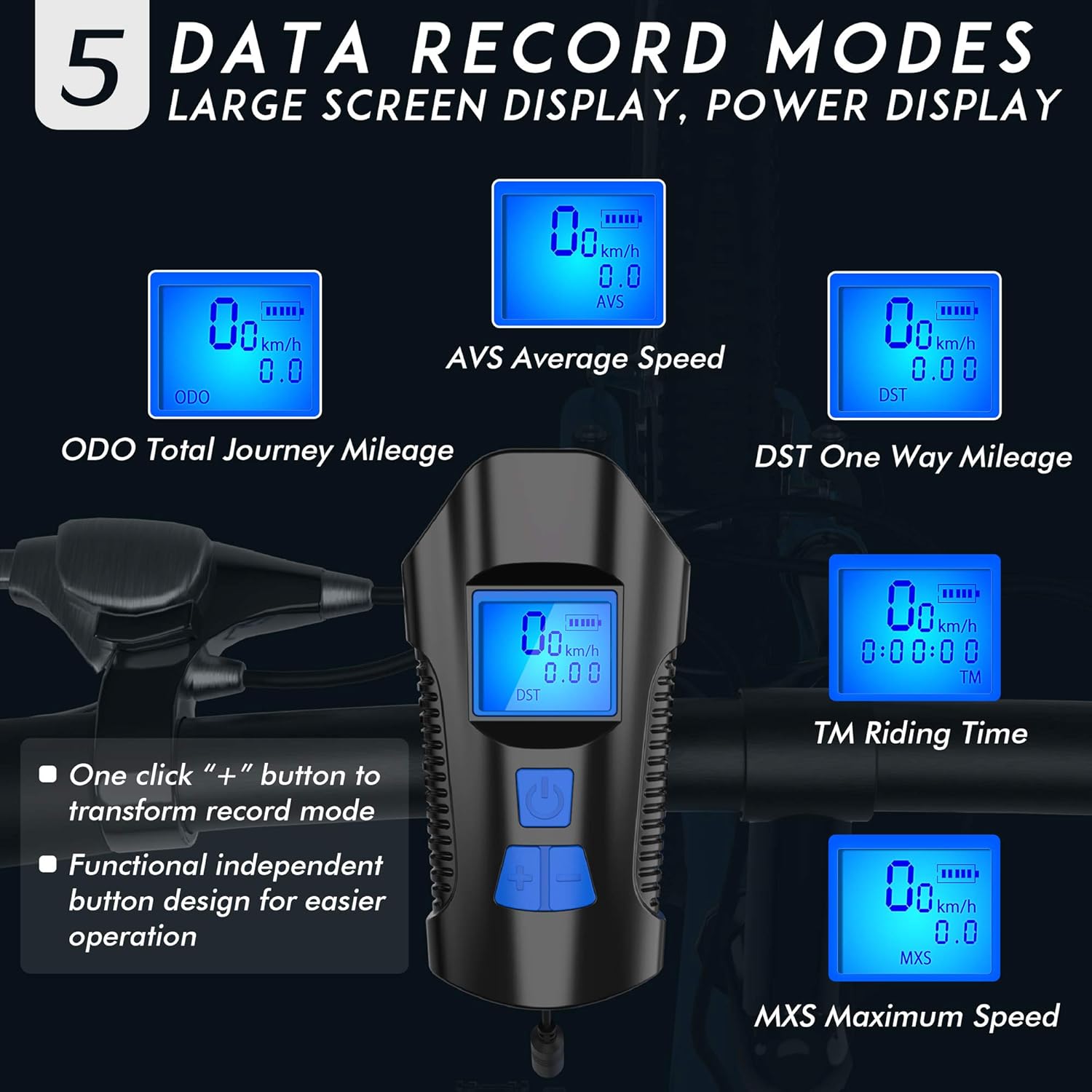 Ordenador para bicicleta y bocina: este ordenador para bicicleta funciona bien para medir y registrar la velocidad, la distancia y el tiempo de conducción, que es lo que cualquier ciclista serio o fanático del fitness necesita saber. Diseño 2 en 1 de luz delantera y bocina para bicicleta. La bocina de bicicleta puede emitir un sonido de advertencia de hasta 120 dB y hay 6 sonidos para cambiar