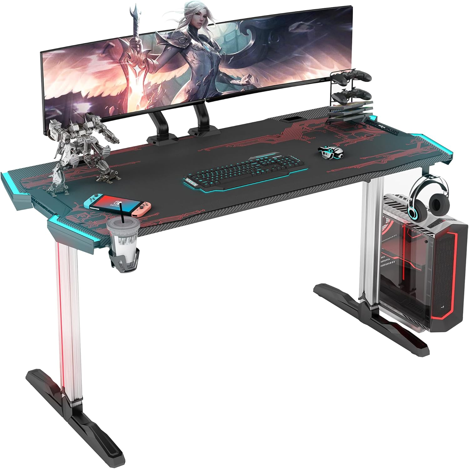 Ultimate 61“Large Gaming Desk with 22 Modes RGB LED Lights, Professional Gamer Computer Desk with Headphone&Cup Holder, Home Office PC Workstation, Full-Surface Cloth Mouse Pad, Black, GX-D