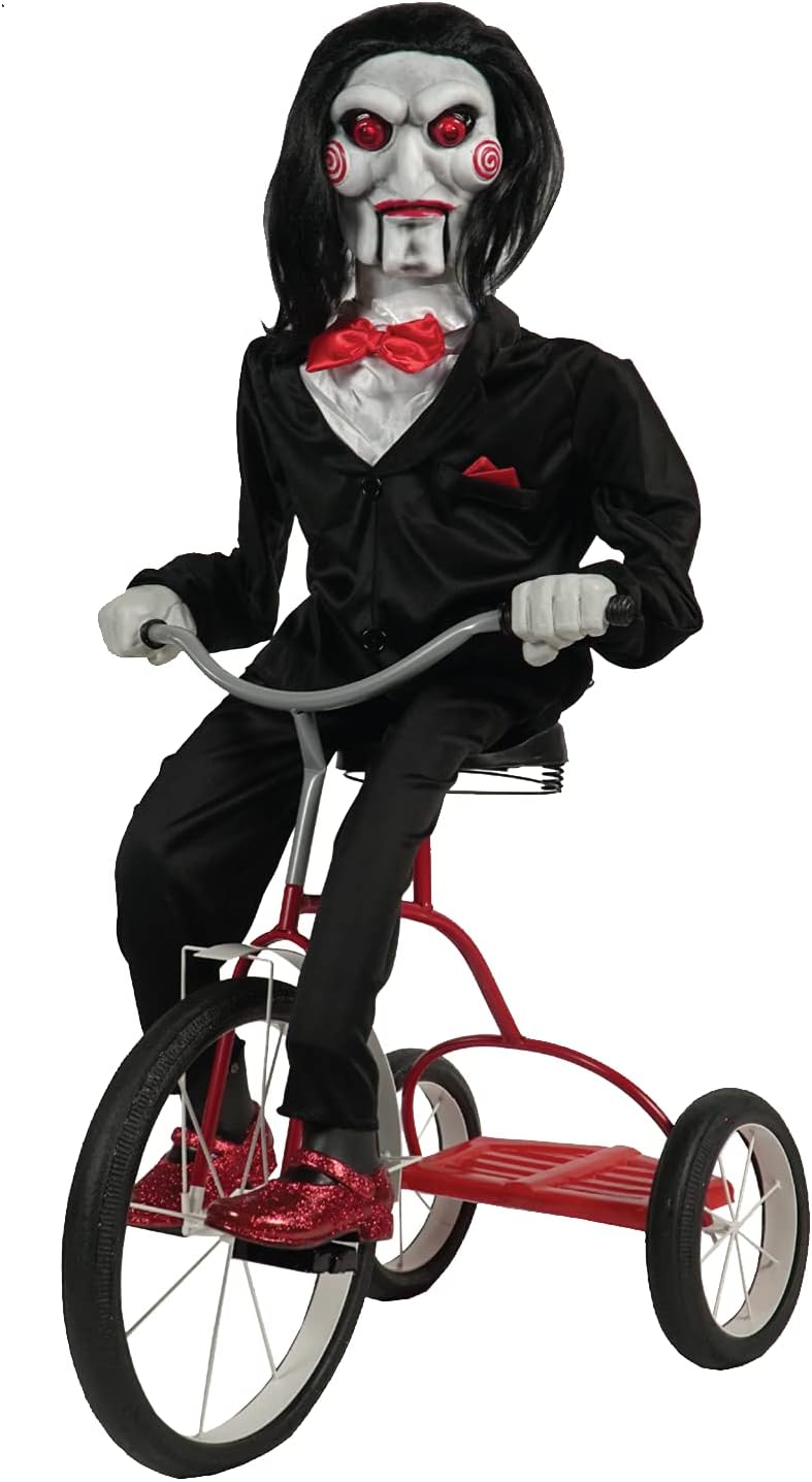 Billy the Puppet on a tricycle from Saw film franchise. Billy's head moves and his eyes light up and he makes noise when he is activated. It is made of plastic, polyester fabric and metal.