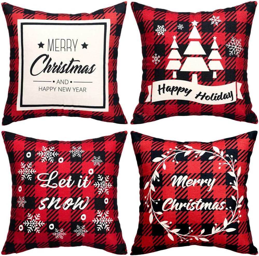 Christmas Pillow Covers 4 Decorative Pillow Covers 18x18 Linen Red Plaid Throw Pillow Covers Xmas Santa Holiday Pillow Covers 4pc Christmas Pillowcase