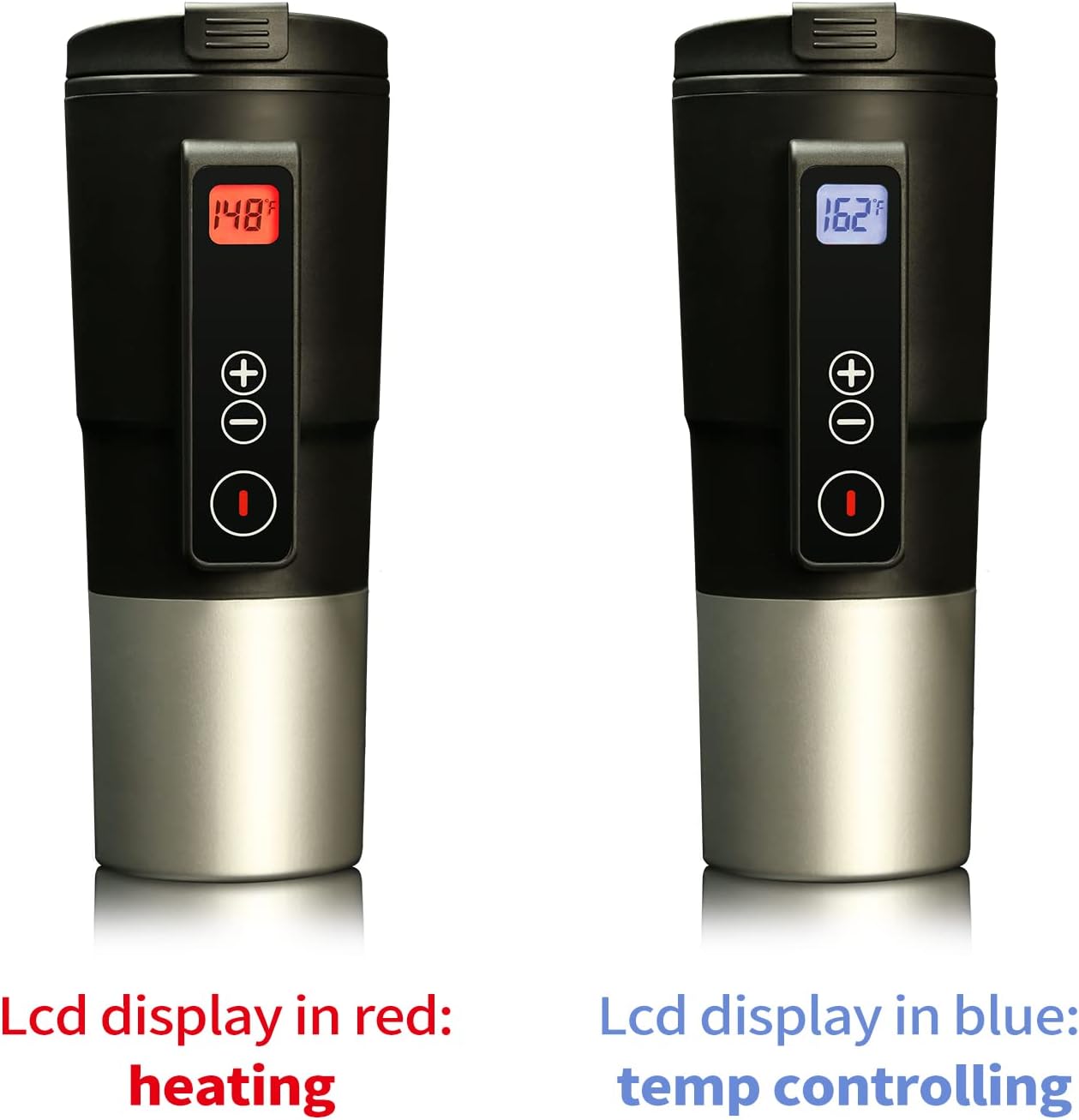 🍵 Easy to use - Car heating cup uses use "+" or "- " button to set temperature, LCD display temperature, there are two colors in different states, red indication is In the heating mode, the blue indicates the heating completed. When the blue color is displayed, you can taste it and enjoy the pleasure of drinking coffee or tea from the first mouth to the last drop.It takes about 15 minutes to heat from normal temperature Coffee to 149 °F.