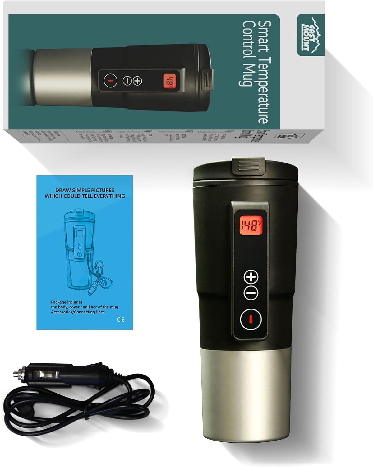 Smart Temperature Control Travel Coffee Mug EAST MOUNT Electric Heated Travel Mug 12V Stainless Steel Tumbler Smart Heating Car Cup Keep Milk Warm LCD Display Easily Washing Safe for use (Black)