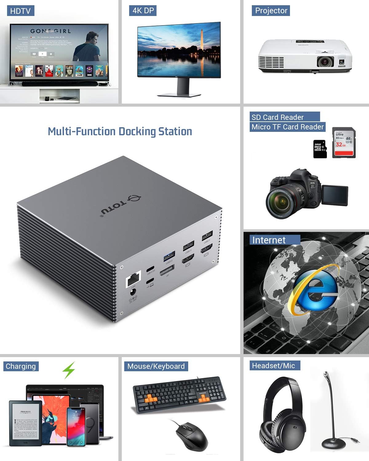 Fácil configuración - El diseño plug-and-play le permite tener todo conectado y acoplado con un solo enchufe. Simplemente conecte el cable de la estación de acoplamiento TOTU para cargar su dispositivo y acceder a monitores externos, teclado y ratón y más. Transforma instantáneamente su portátil/tableta en una PC de escritorio y ahorra el desorden de cables en su escritorio. El TOTU Dock está diseñado para aumentar su productividad.