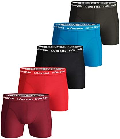Great-value men's underwear 5-pack. Fantastically-valued 5-pack of Bjorn Borg boxer trunks in a variety of vibrant colours. This is a great-value 5-pack of mid-rise boxer trunks in a mix of colours from Bjorn Borg with a reinforced front pouch, shaped with no-fly for extra support and comfort. Featuring stretch waistbands with interwoven branding and flat lock stitching. These boxers are finished without a fly opening. Pre Spring Summer 2020 Collection. Small = 30-32 inch waist, Medium = 32-34, Large = 34-36, X-Large = 36-38, XX-Large = 38-40