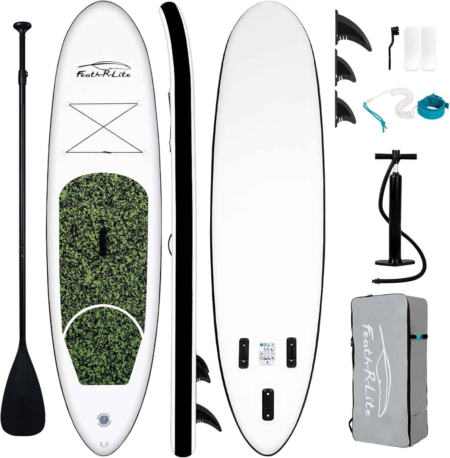 Discover the fun of paddleboarding with this Feath-R-Lite inflatable stand up paddle board, designed for beginners and perfect for marine, river, and lake activities. The board is made of durable double-layer PVC material, with a high-density wire drawing and airtight valve, ensuring safety and longevity. It measures 10' x 30" x 6" and has a maximum weight recommendation of 280 pounds, while weighing only 16.7 pounds itself. The package includes an adjustable aluminum paddle, high pressure pump, removable sup fin, travel backpack, sup leash, repair bucket, and instruction manual. The board is easy to inflate and deflate, making it convenient to store and transport. Experience the beauty of water activities with this Feath-R-Lite paddle board.