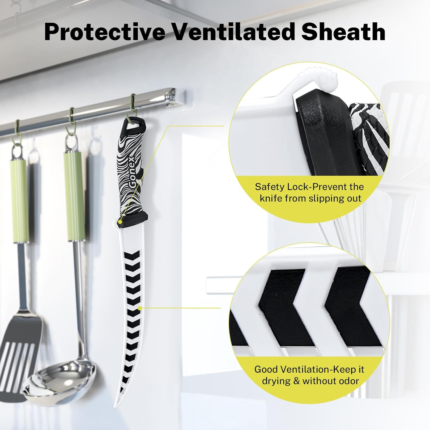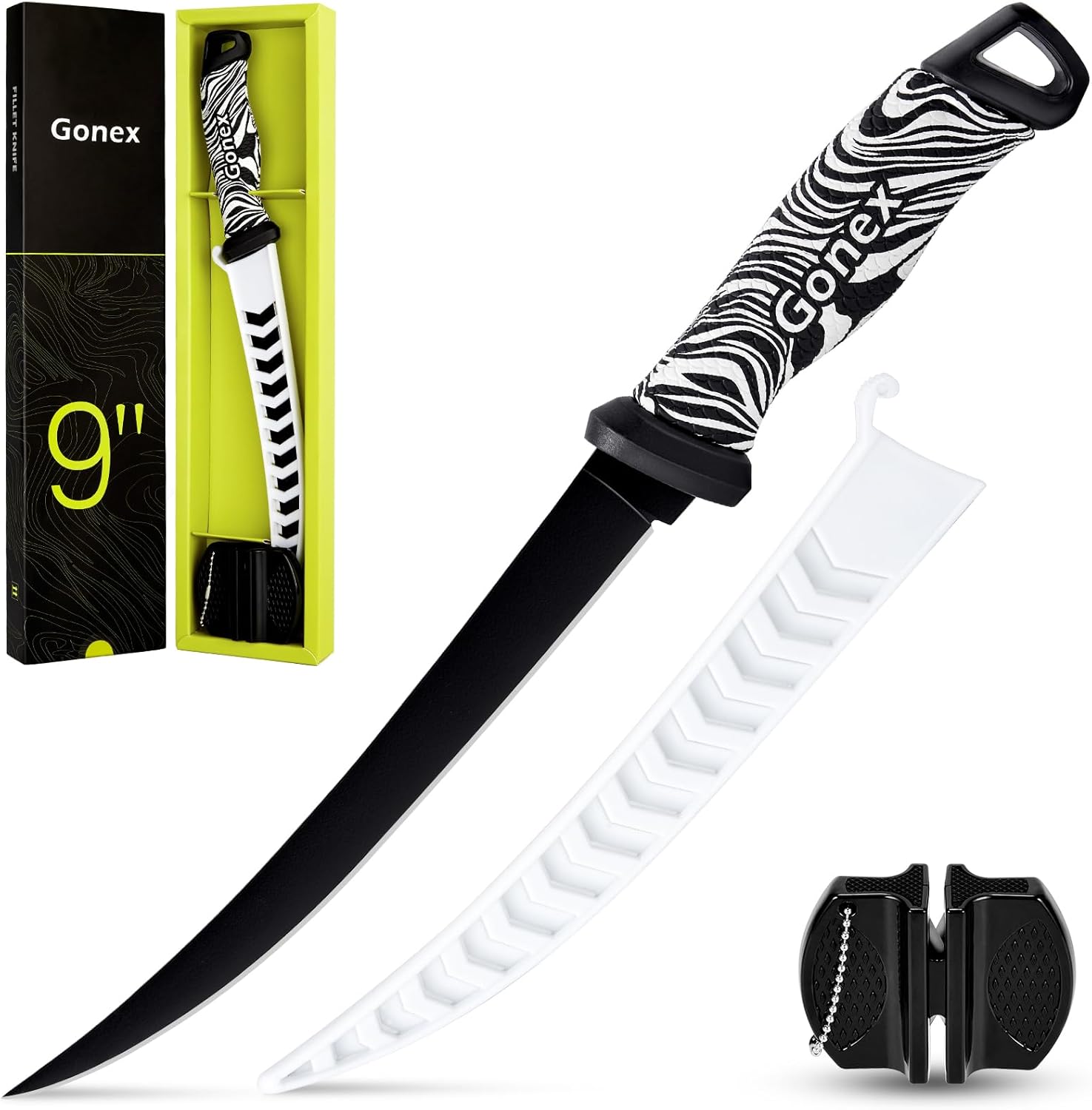 ASPECTO ELEGANTE Y LONGITUD PERFECTA: el mango con rayas de cebra en blanco y negro, el acabado en teflón negro y la funda blanca irradian un sentido fresco y vivo, simple pero especial y elegante. Hay 2 longitudes diferentes disponibles: los cuchillos para filetes de 7 y 9 pulgadas tienen la flexibilidad perfecta para diferentes formas de manipular el pescado. La longitud específica es la siguiente, longitud de la hoja: 7 pulgadas/9 pulgadas (17,78 cm/22,86 cm) y longitud total: 12,6 pulgadas/15 pulgadas (32 cm/38 cm). AFILADOR DE